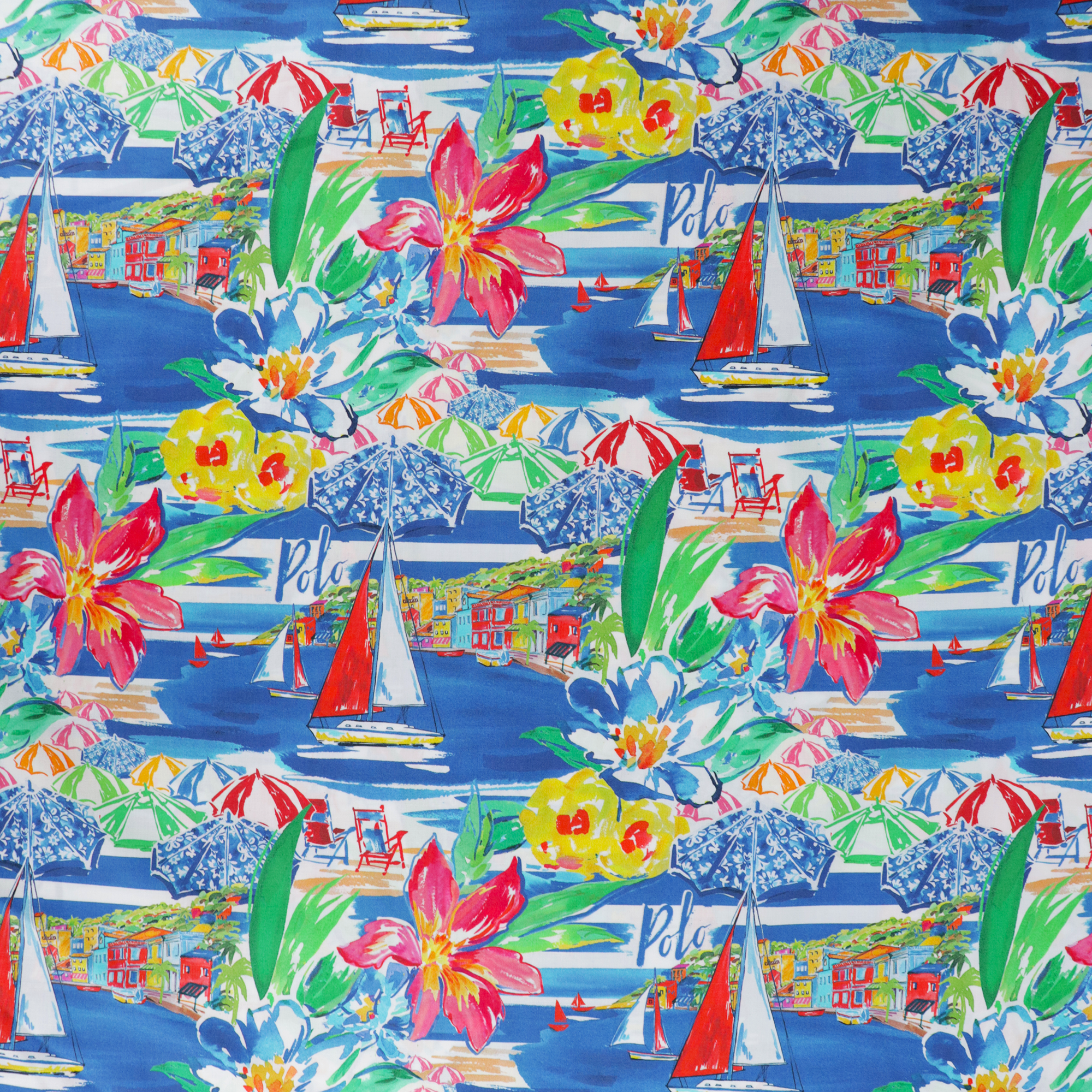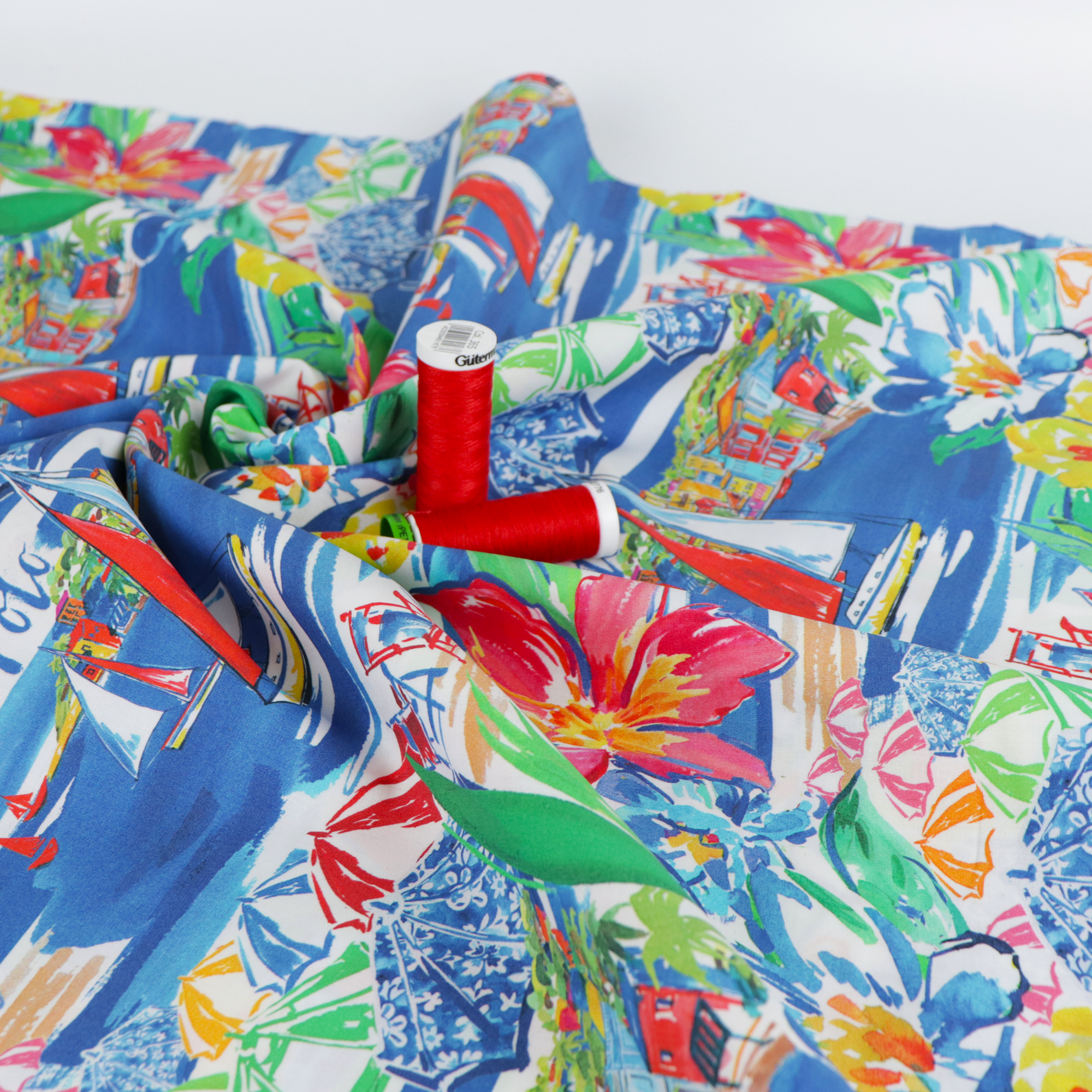 Composition: 100% Cotton Width: 150cm Weight: Light weight Drape: Moderate Print: Directional | Largest sewing boat measures approximately 10cm x 6cm, largest flower measures approximately 9.5cm Opacity: Opaque Care: Pre wash at 30 degrees, low heat iron on the reverse