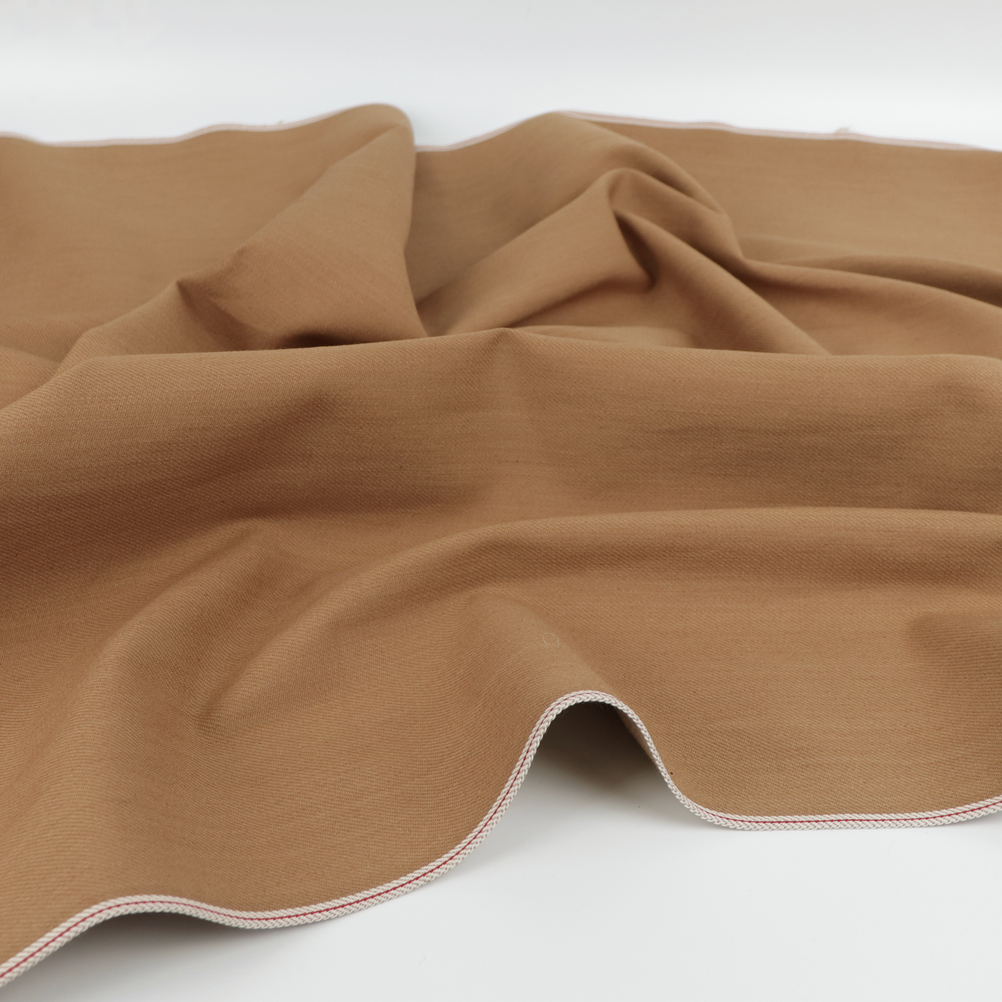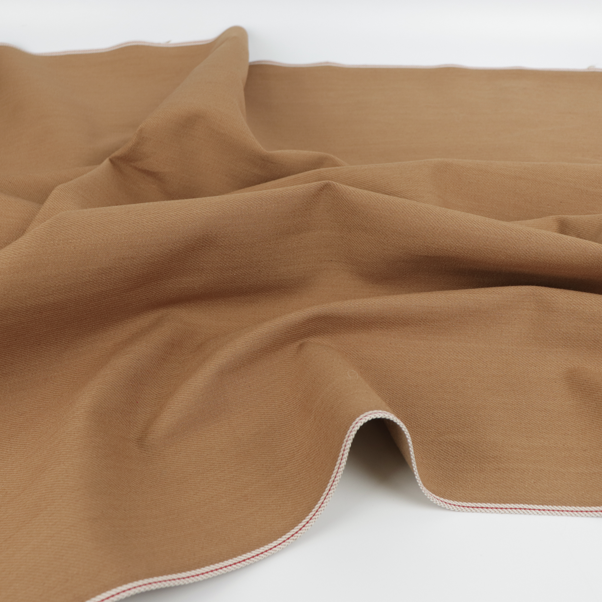 Japanese selvedge denim is a light caramel colour. It is a narrow width fabric with a small amount of two way stretch. It would look great sewn up into a pair of trousers, a skirt, dungarees and so on.