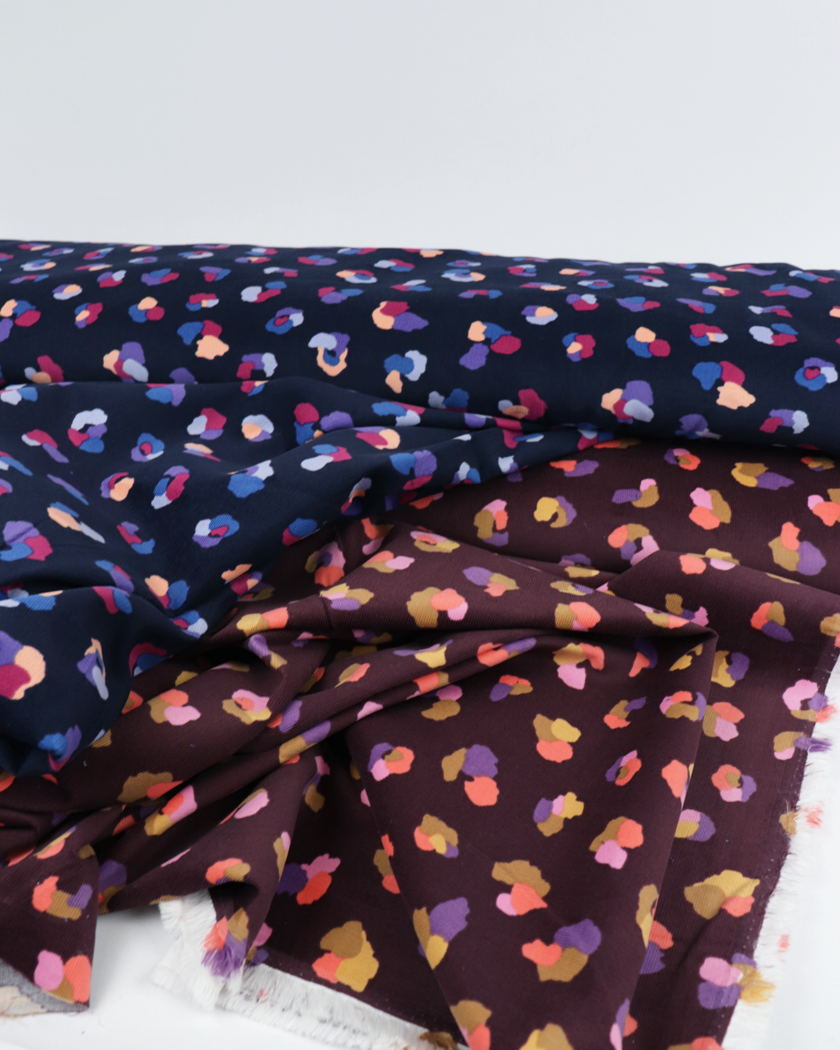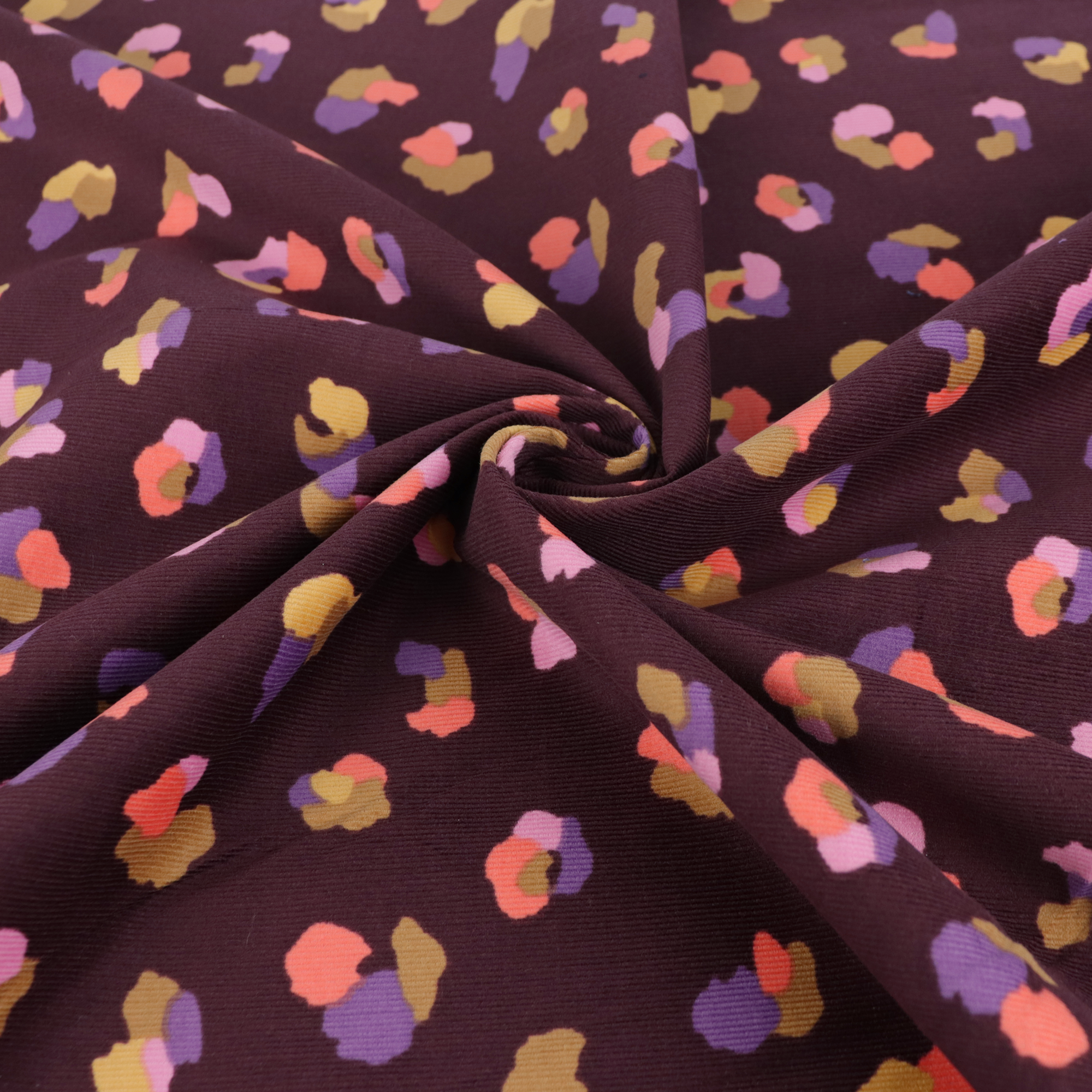 Cotton needlecord is a maroon colour and is covered in a fun colourful animal print inspired design. The fabric is a very fine needlecord which results in a velvet like texture. It would be perfect for sewing yourself a shirt, skirt, pair of trousers or a dress.
