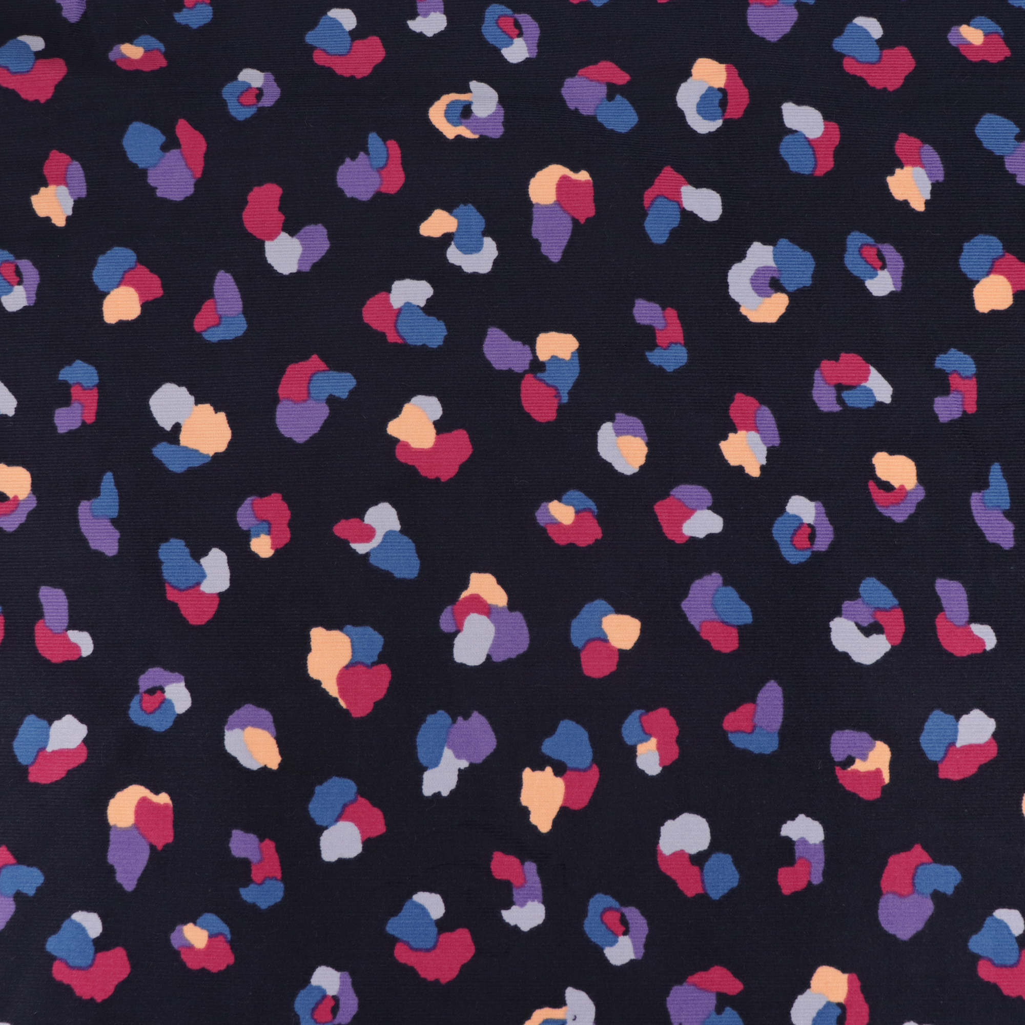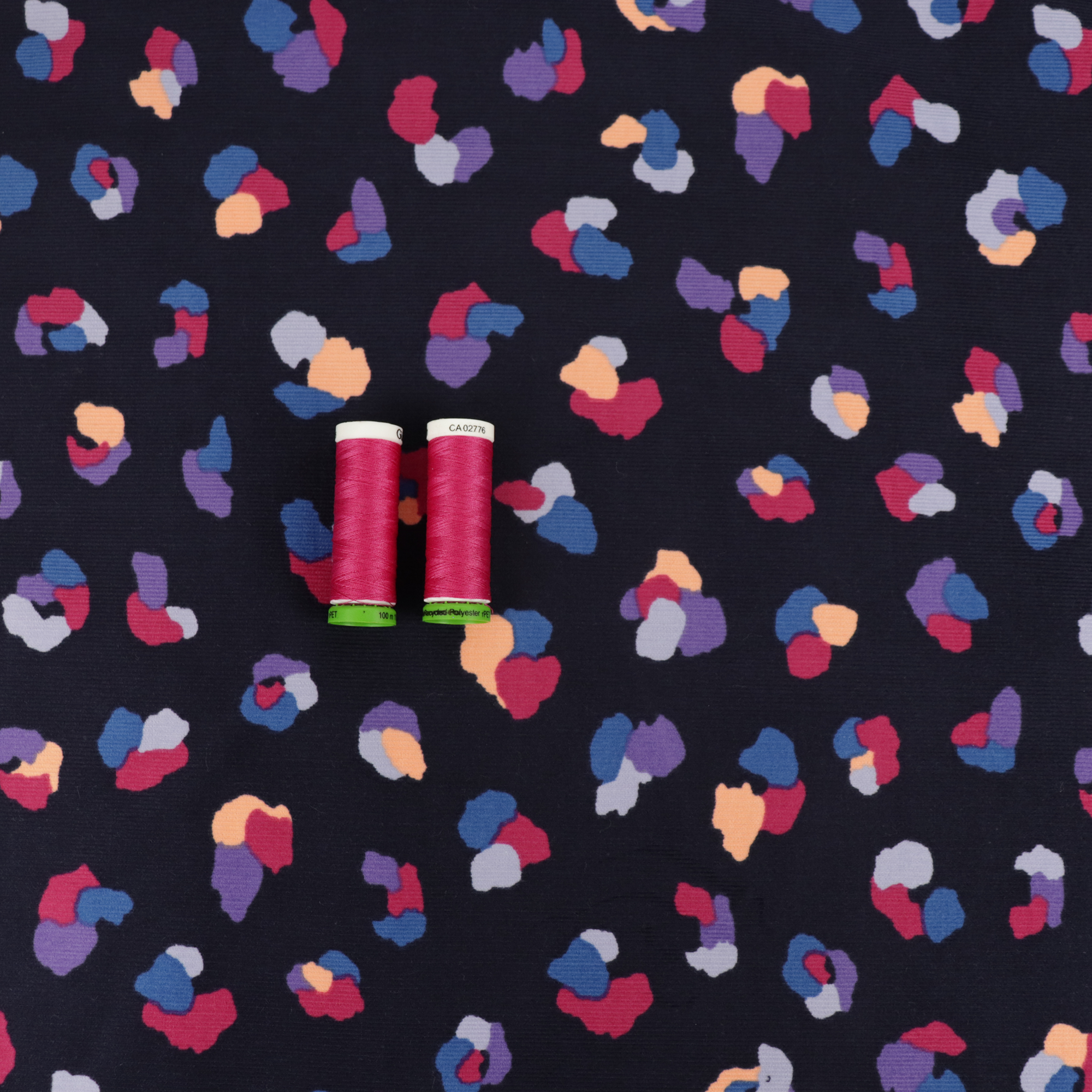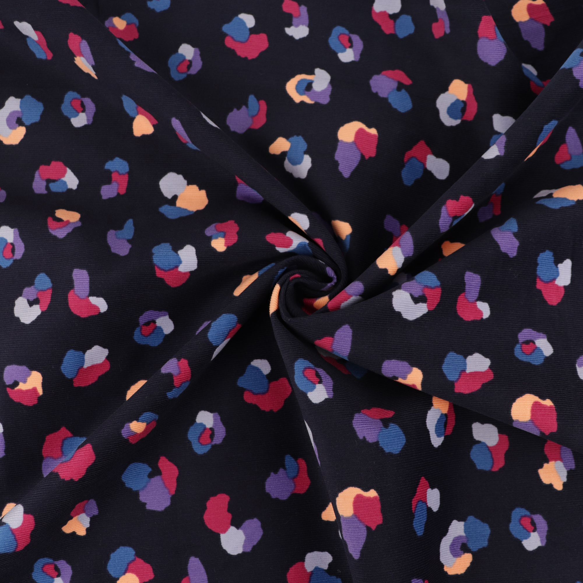 Cotton needlecord is a navy blue colour and is covered in a fun colourful animal print inspired design. The fabric is a very fine needlecord which results in a velvet like texture. It would be perfect for sewing yourself a shirt, skirt, pair of trousers or a dress.