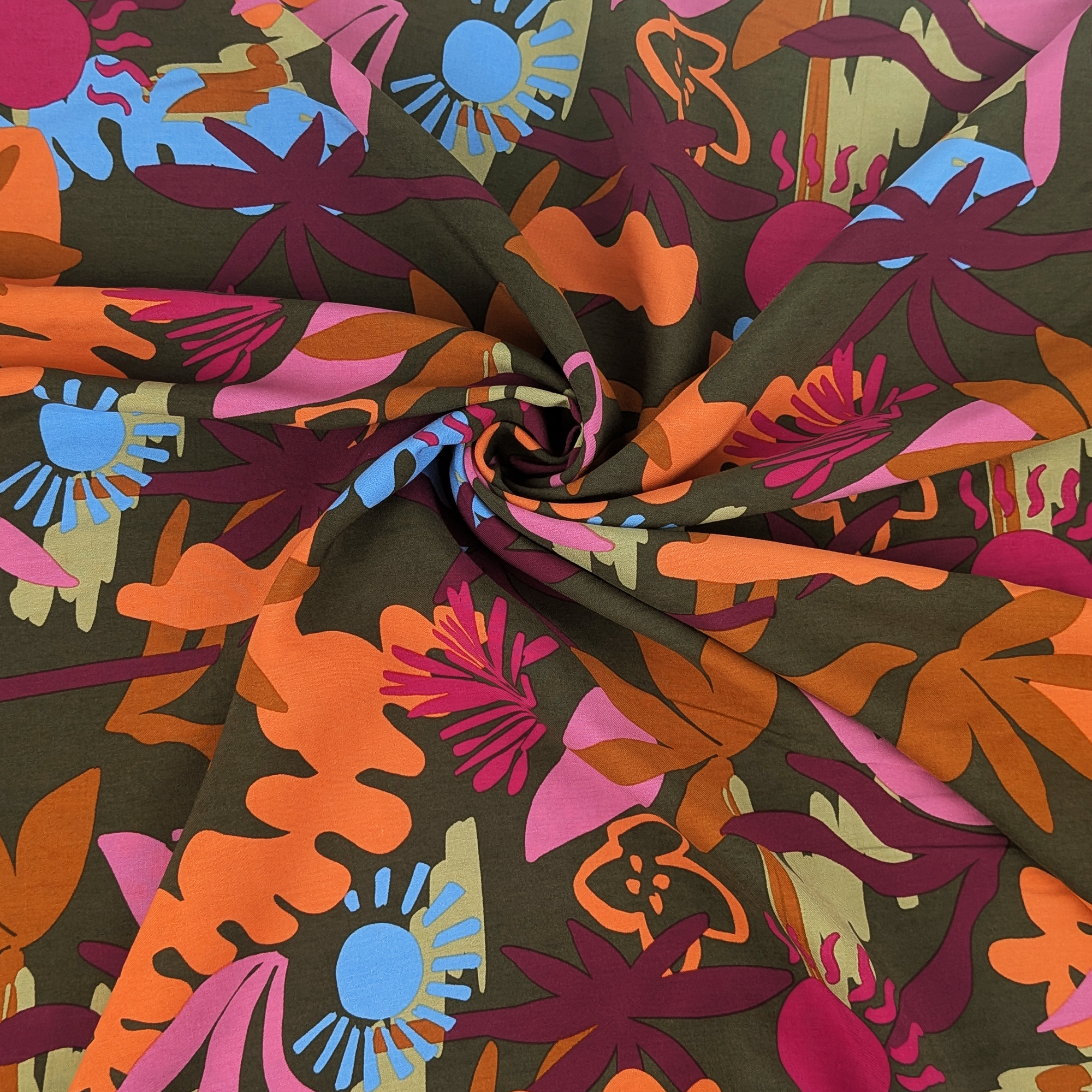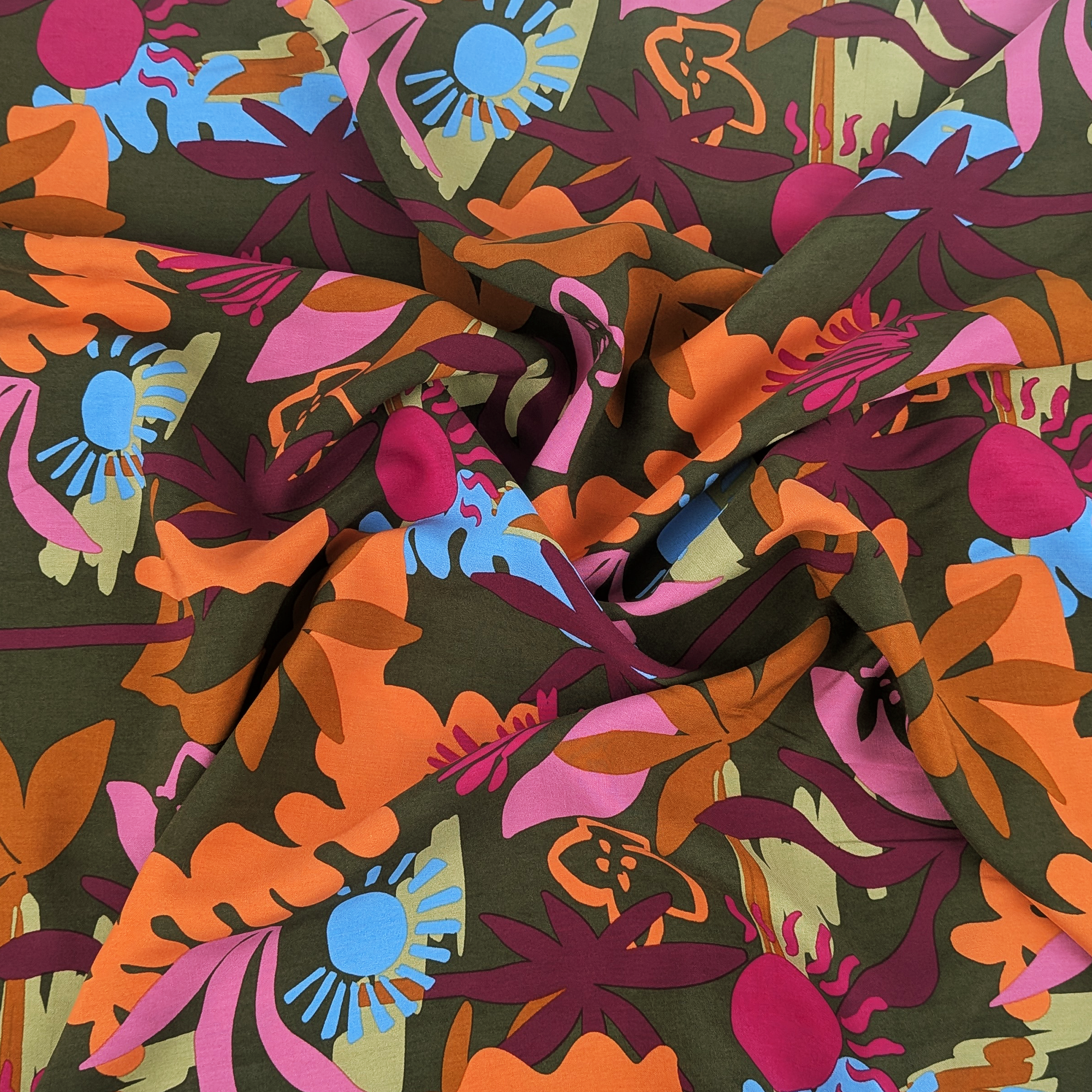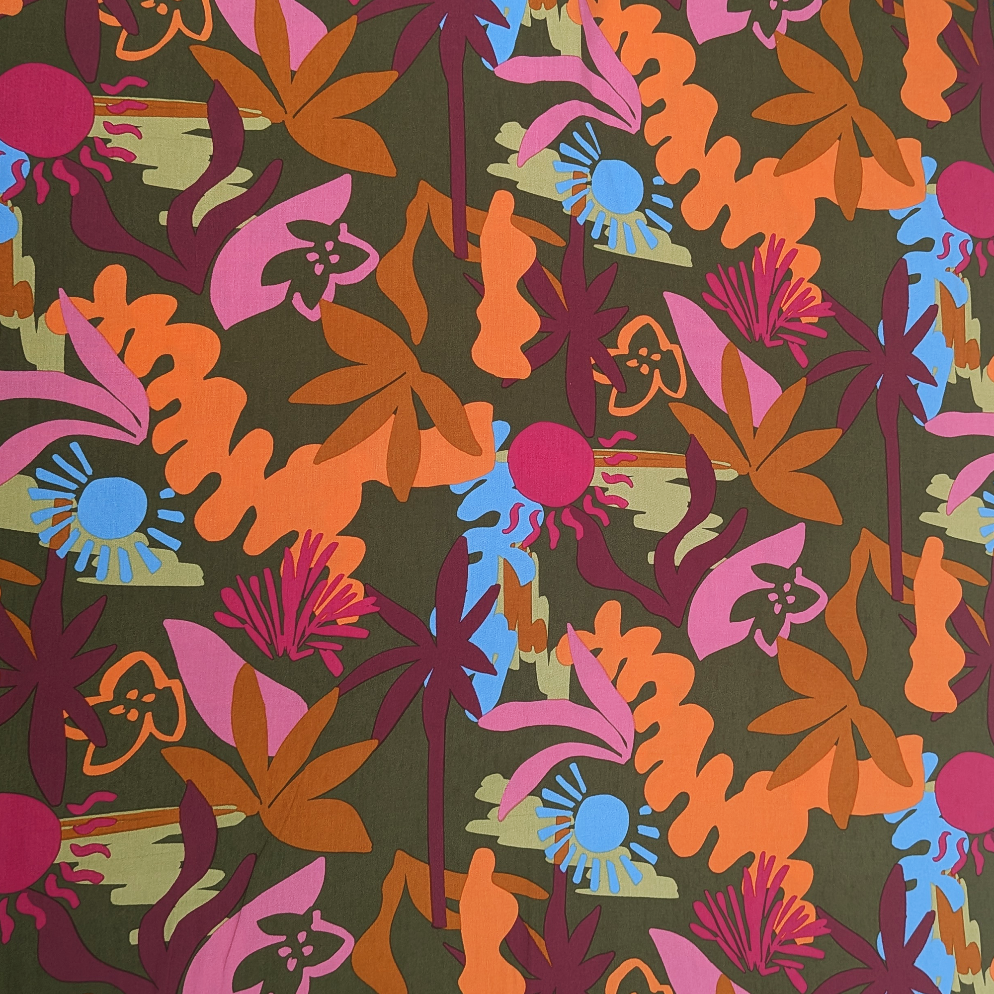 Viscose lawn dressmaking fabric has a fluid drape and is soft against the skin. It has a green background and is covered in a fun abstract design featuring images that remind us of a sunny holiday. It is ideal for floaty blouses, dresses and skirts.