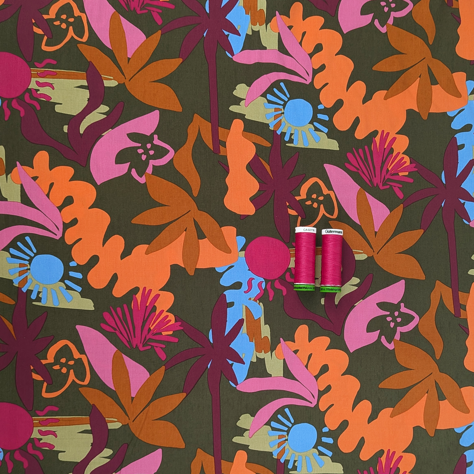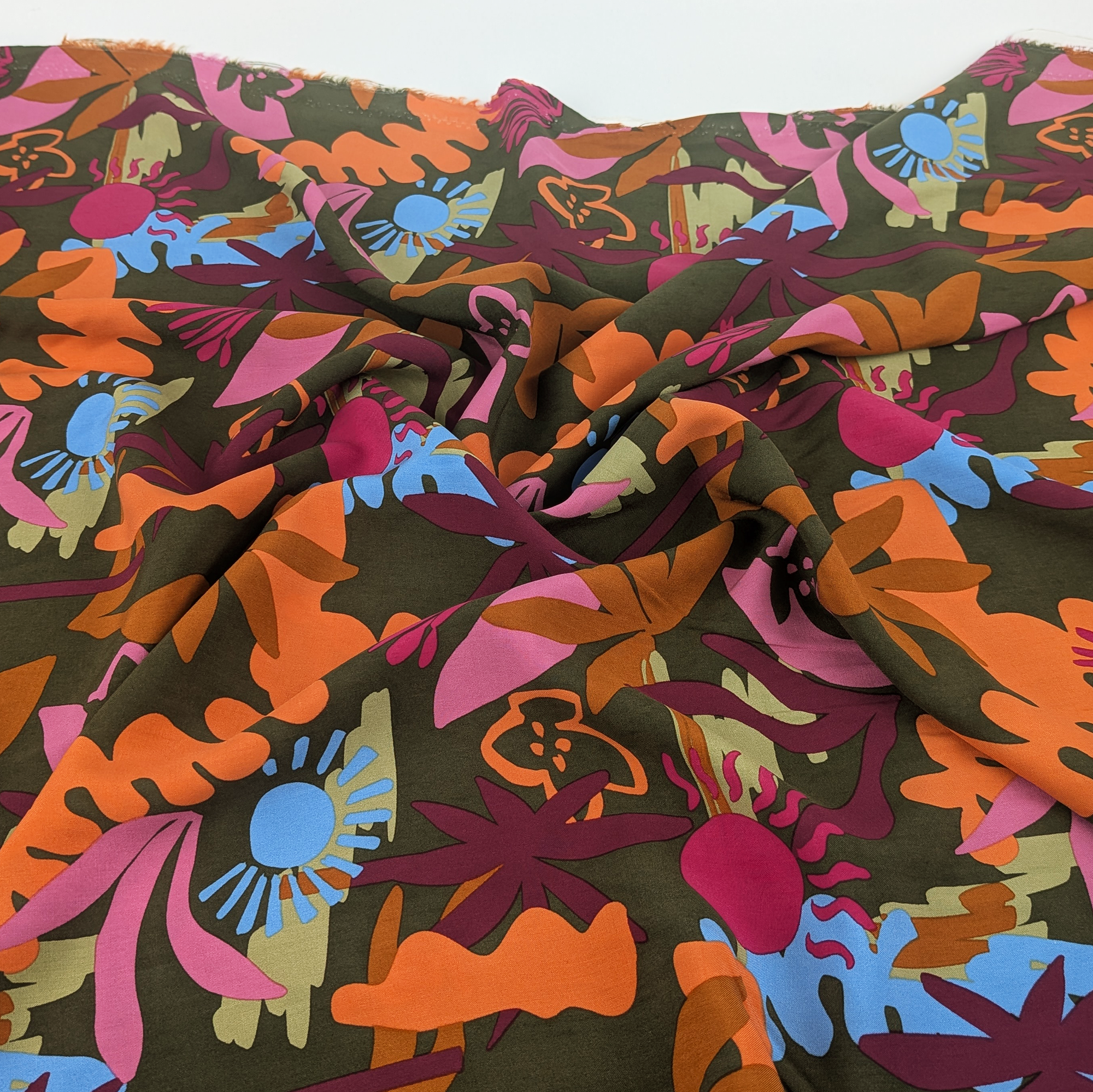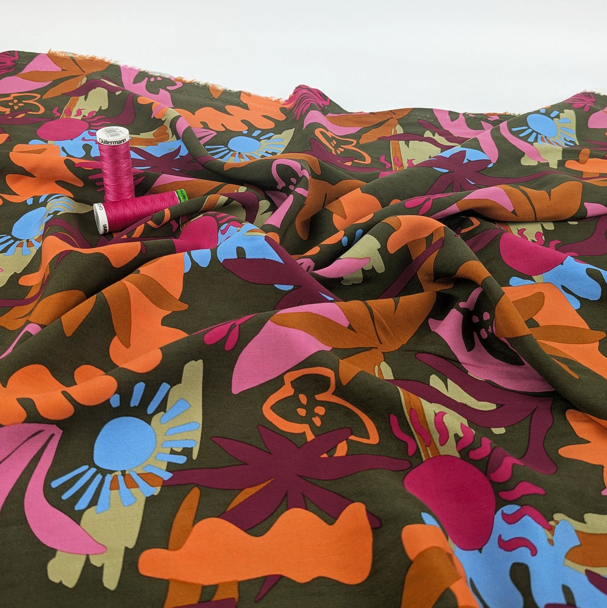 Viscose lawn dressmaking fabric has a fluid drape and is soft against the skin. It has a green background and is covered in a fun abstract design featuring images that remind us of a sunny holiday. It is ideal for floaty blouses, dresses and skirts.