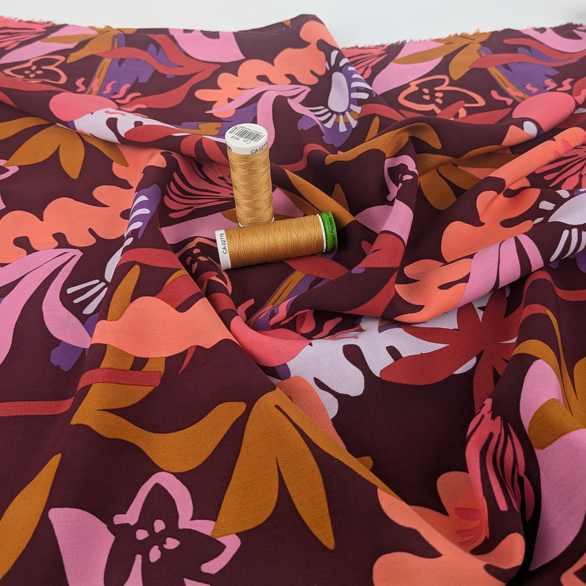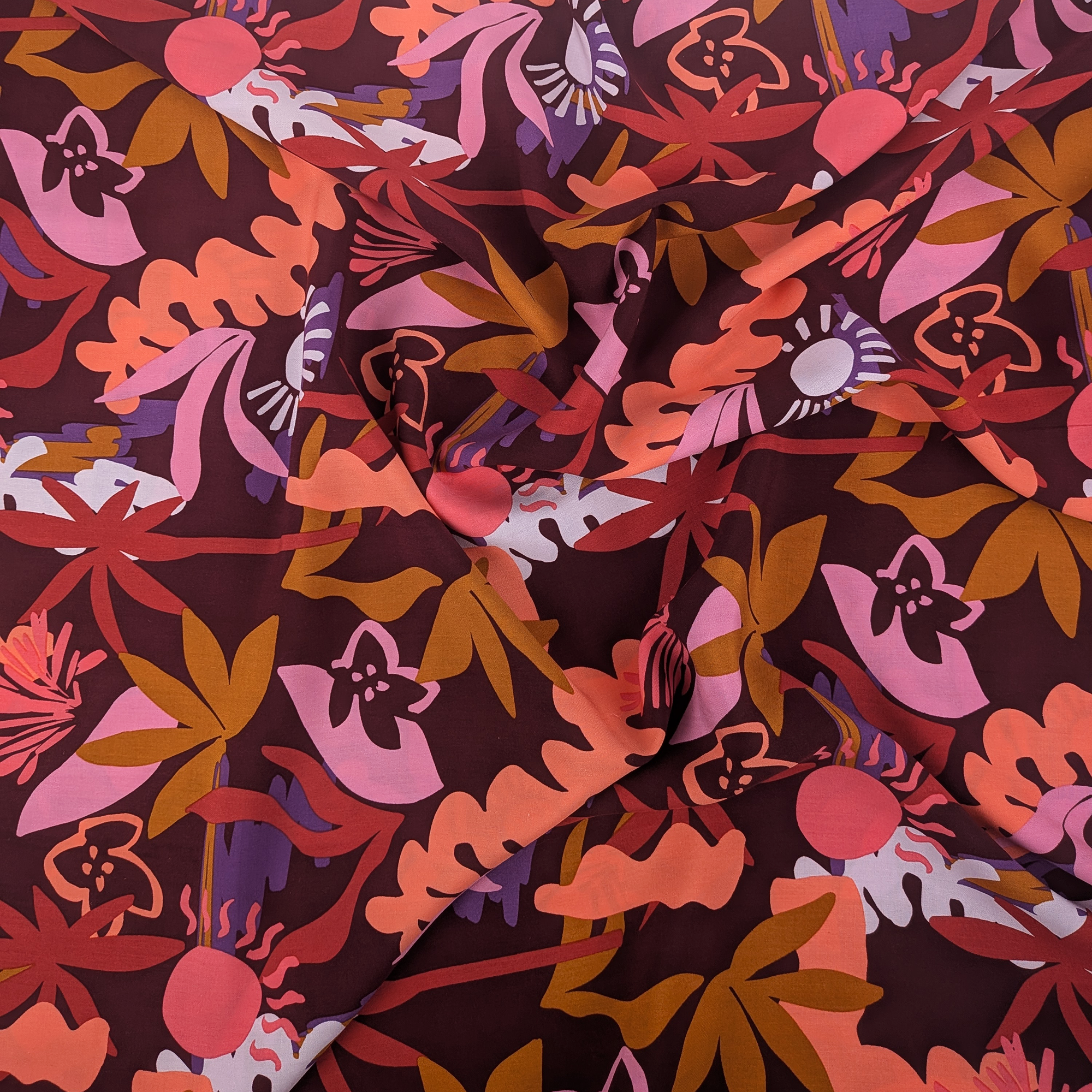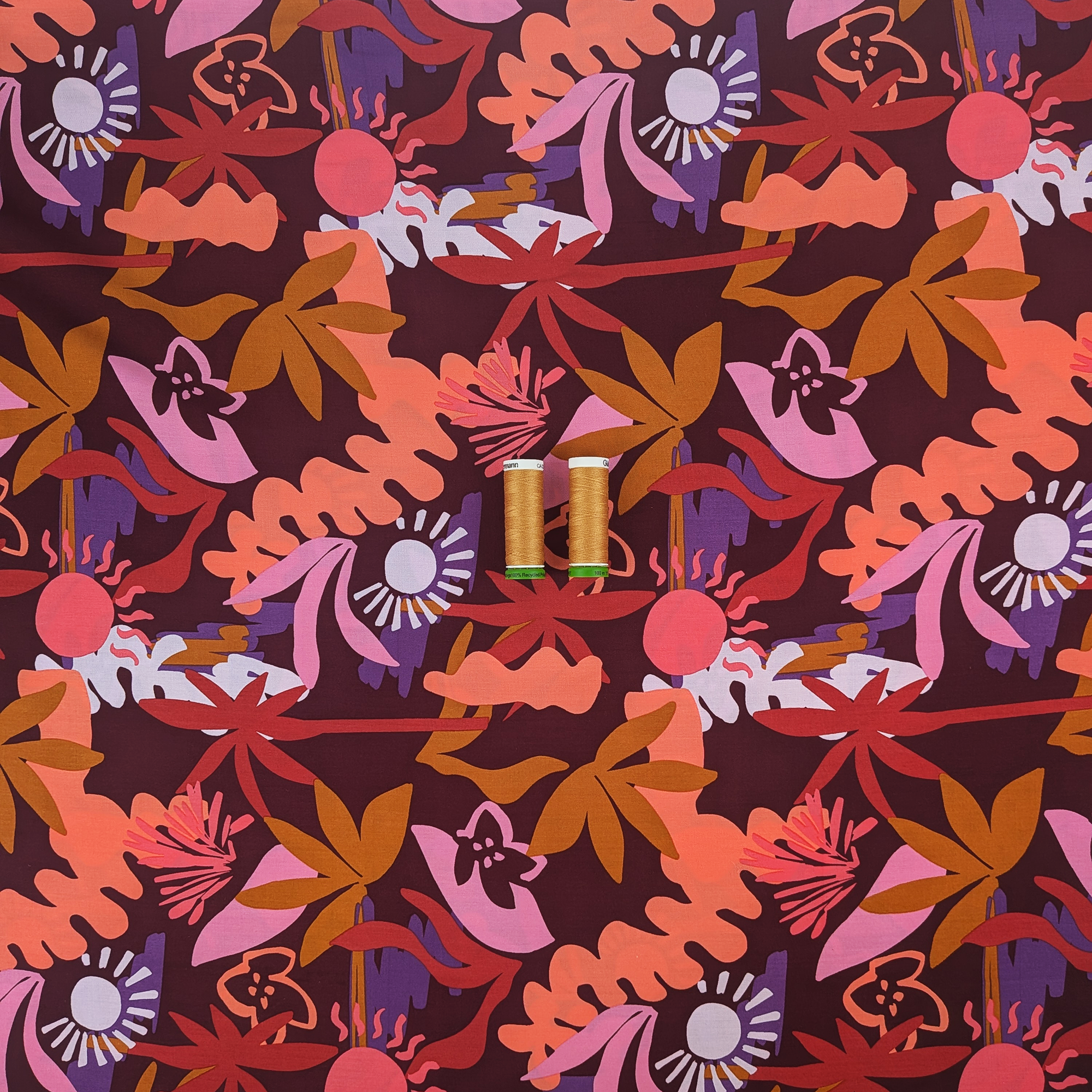 Viscose lawn dressmaking fabric has a fluid drape and is soft against the skin. It has a maroon coloured background and is covered in a fun abstract design featuring images that remind us of a sunny holiday. It is ideal for floaty blouses, dresses and skirts.