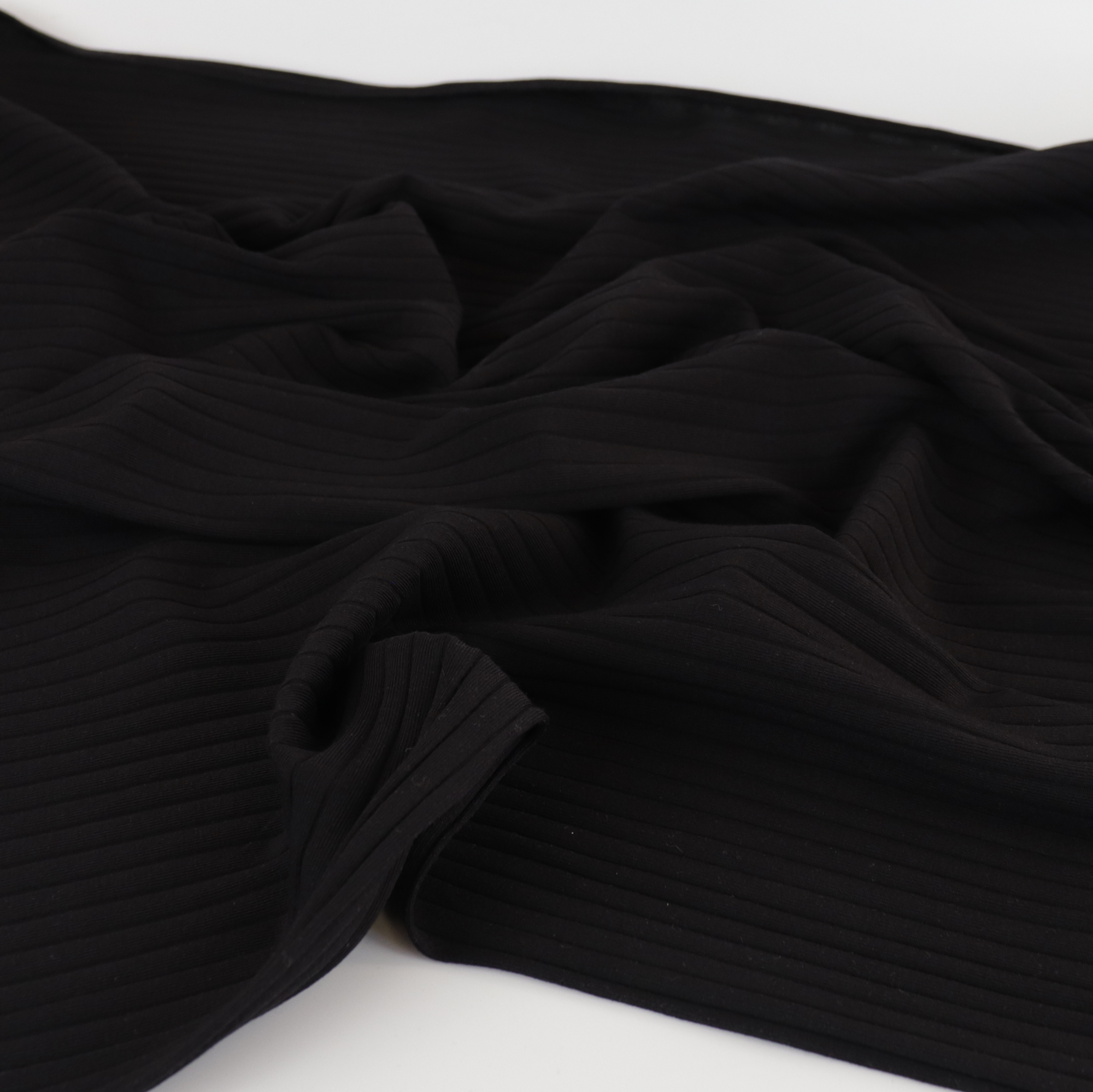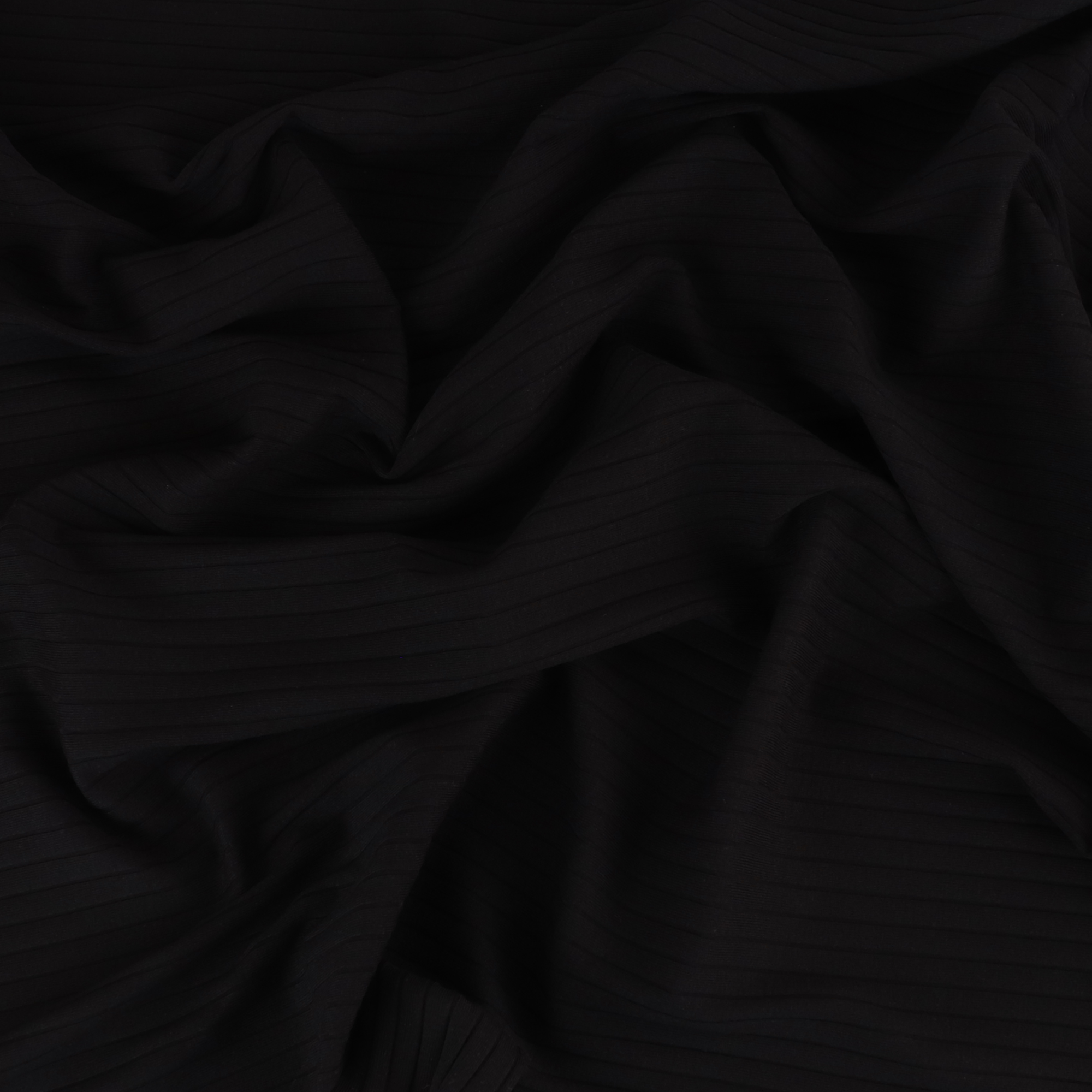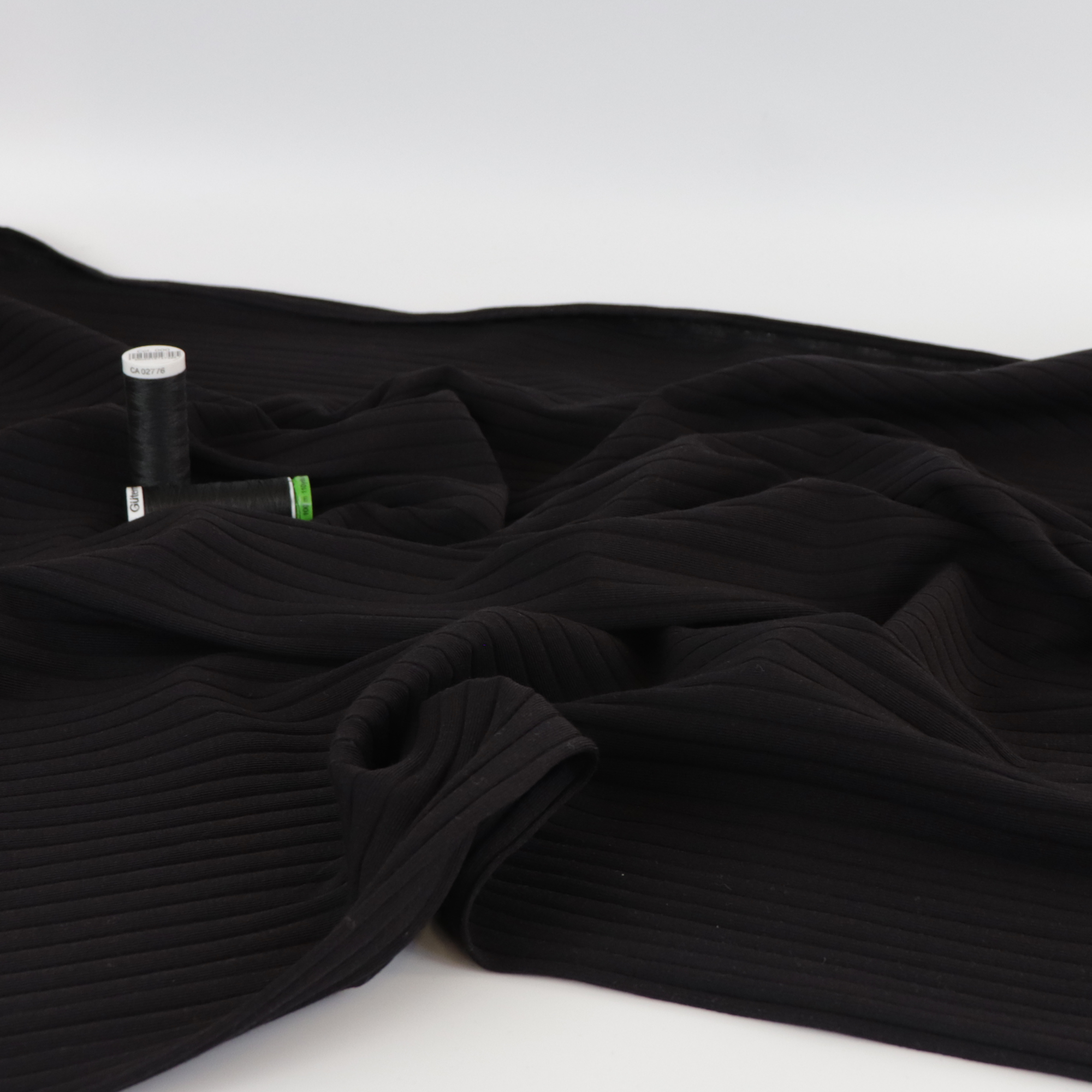 Cotton ribbed jersey has been yarn dyed a black colour. The ribs run parallel to the selvedge and each rib is approximately 0.5cm wide. This fabric has a good 4 way stretch and recovery. It would be ideal for sewing yourself a rolled neck top or t-shirt. Patterns such as the Nikko by True Bias or the Rio Ringer by True Bias.