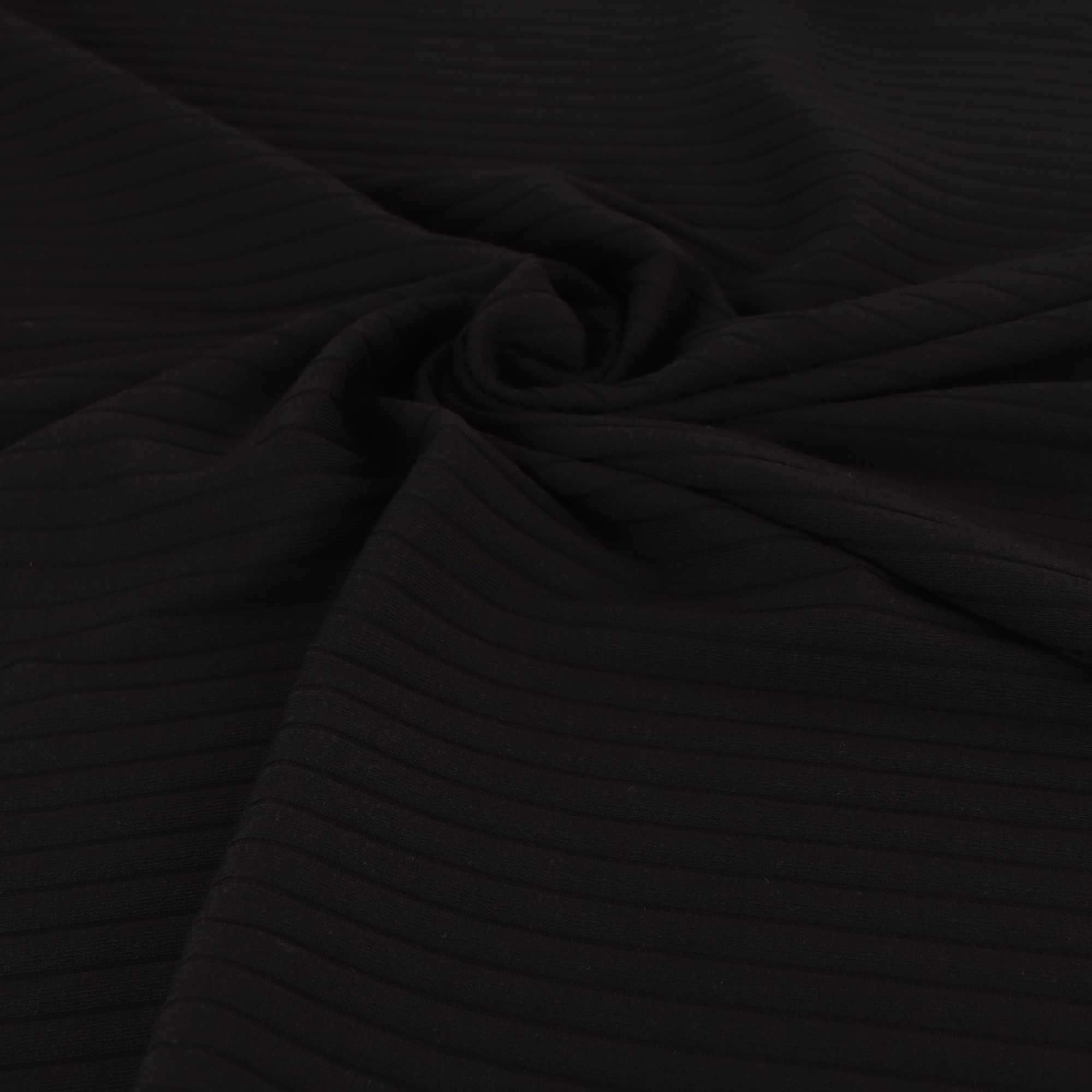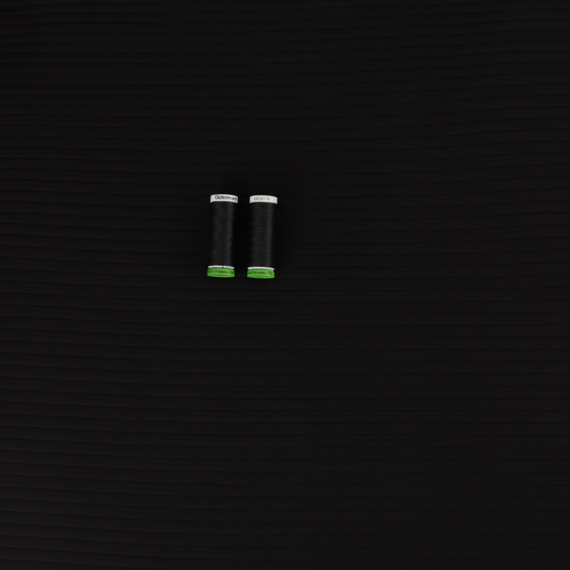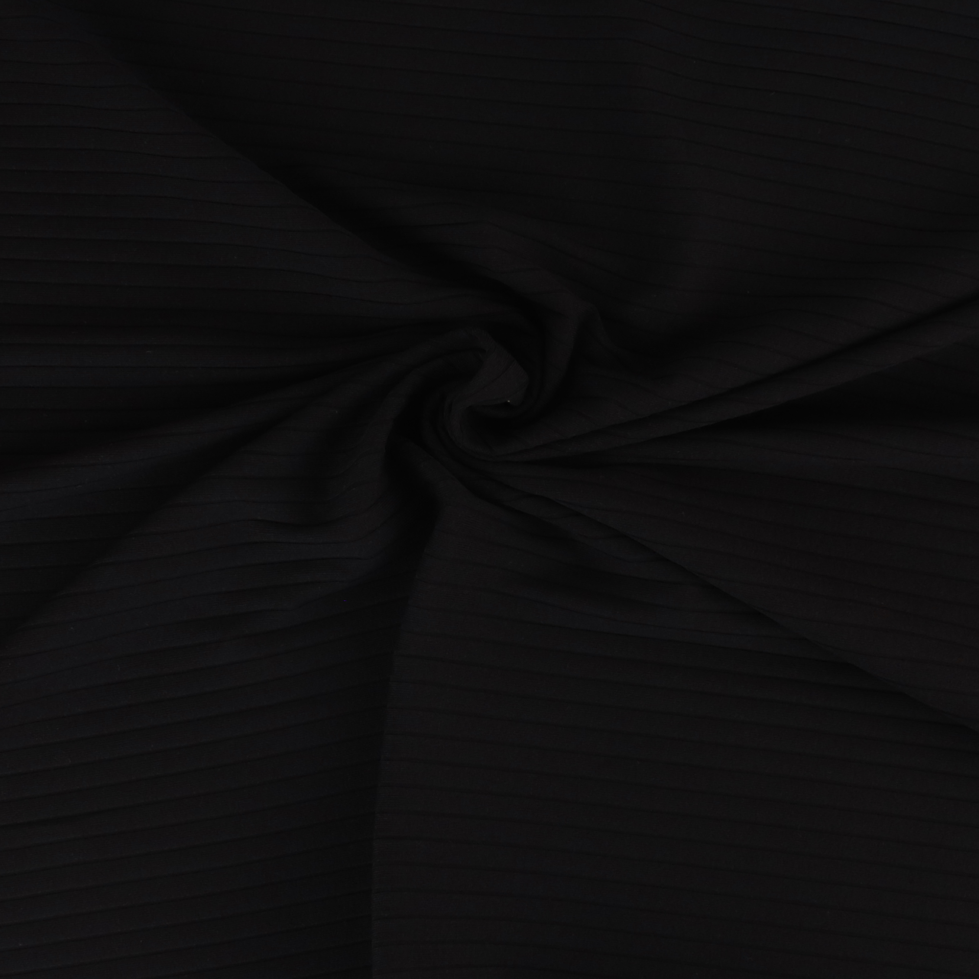 Cotton ribbed jersey has been yarn dyed a black colour. The ribs run parallel to the selvedge and each rib is approximately 0.5cm wide. This fabric has a good 4 way stretch and recovery. It would be ideal for sewing yourself a rolled neck top or t-shirt. Patterns such as the Nikko by True Bias or the Rio Ringer by True Bias.