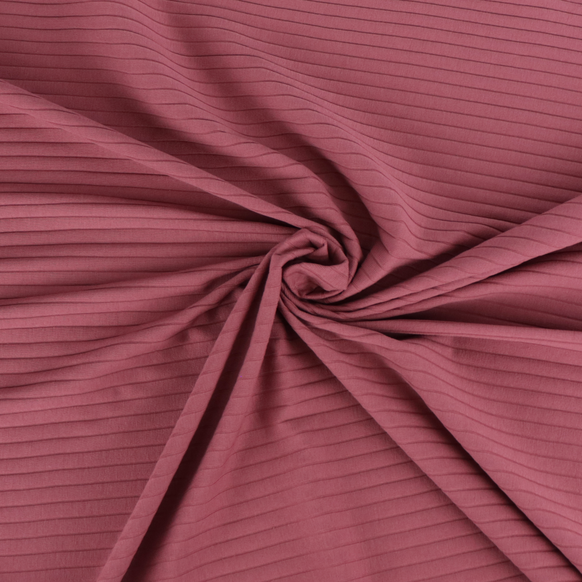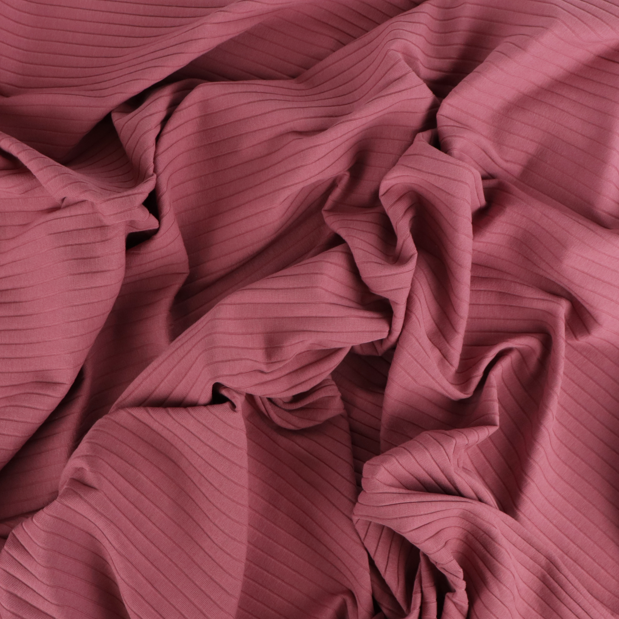 Cotton ribbed jersey has been yarn dyed a dark blush pink colour. The ribs run parallel to the selvedge and each rib is approximately 0.5cm wide. This fabric has a good 4 way stretch and recovery. It would be ideal for sewing yourself a rolled neck top or t-shirt. Patterns such as the Nikko by True Bias or the Rio Ringer by True Bias.