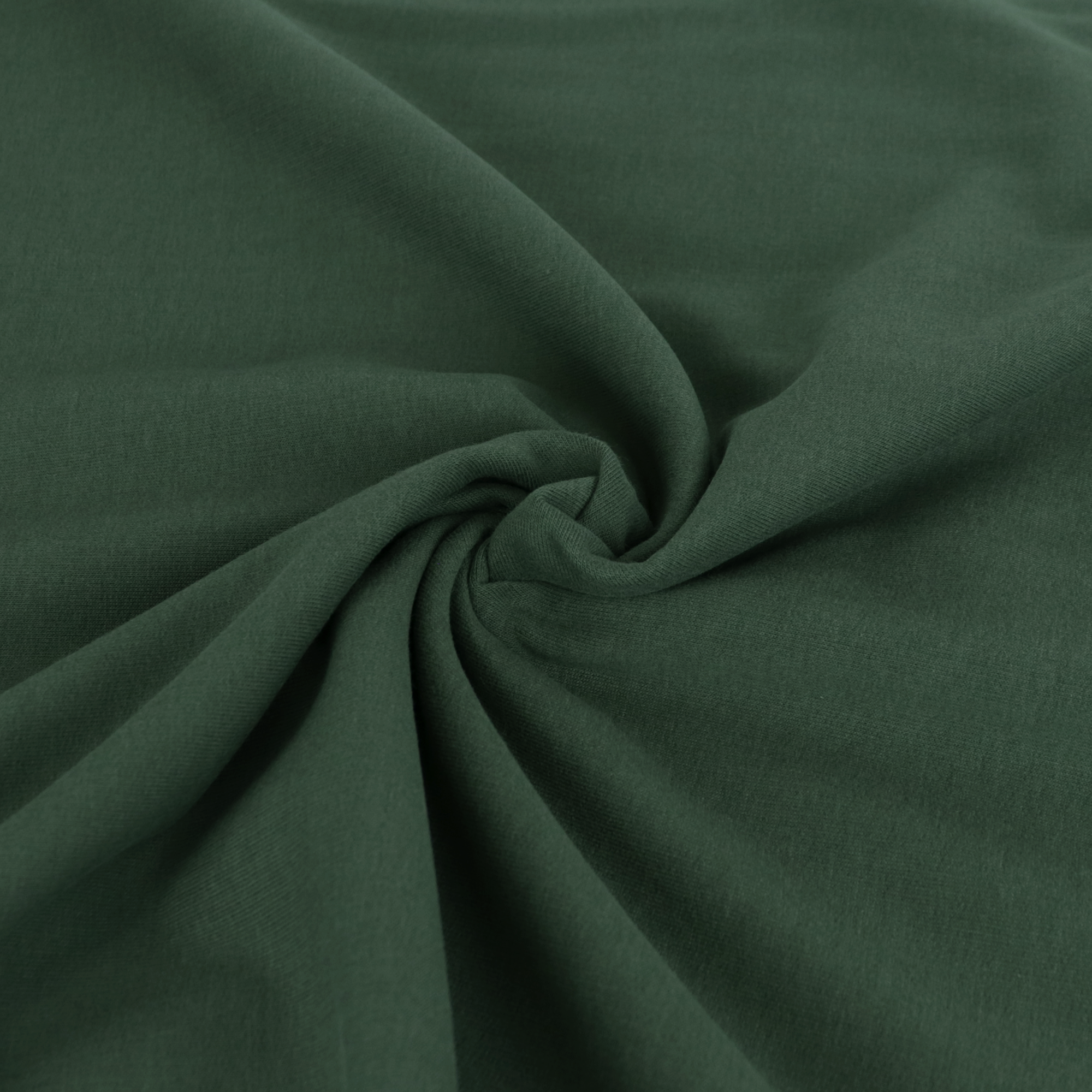 Organic cotton sweatshirt jersey has a soft brushed back. This is a lighter weight sweatshirting fabric, similar weight to a french terry with a fleece backing. It would work well sewn up into a sweatshirt and sweatpants, patterns such as the Grainline Studio Linden sweatshirt or Hudson Joggers from True Bias. This sweatshirt jersey has been yarn dyed a green colour.