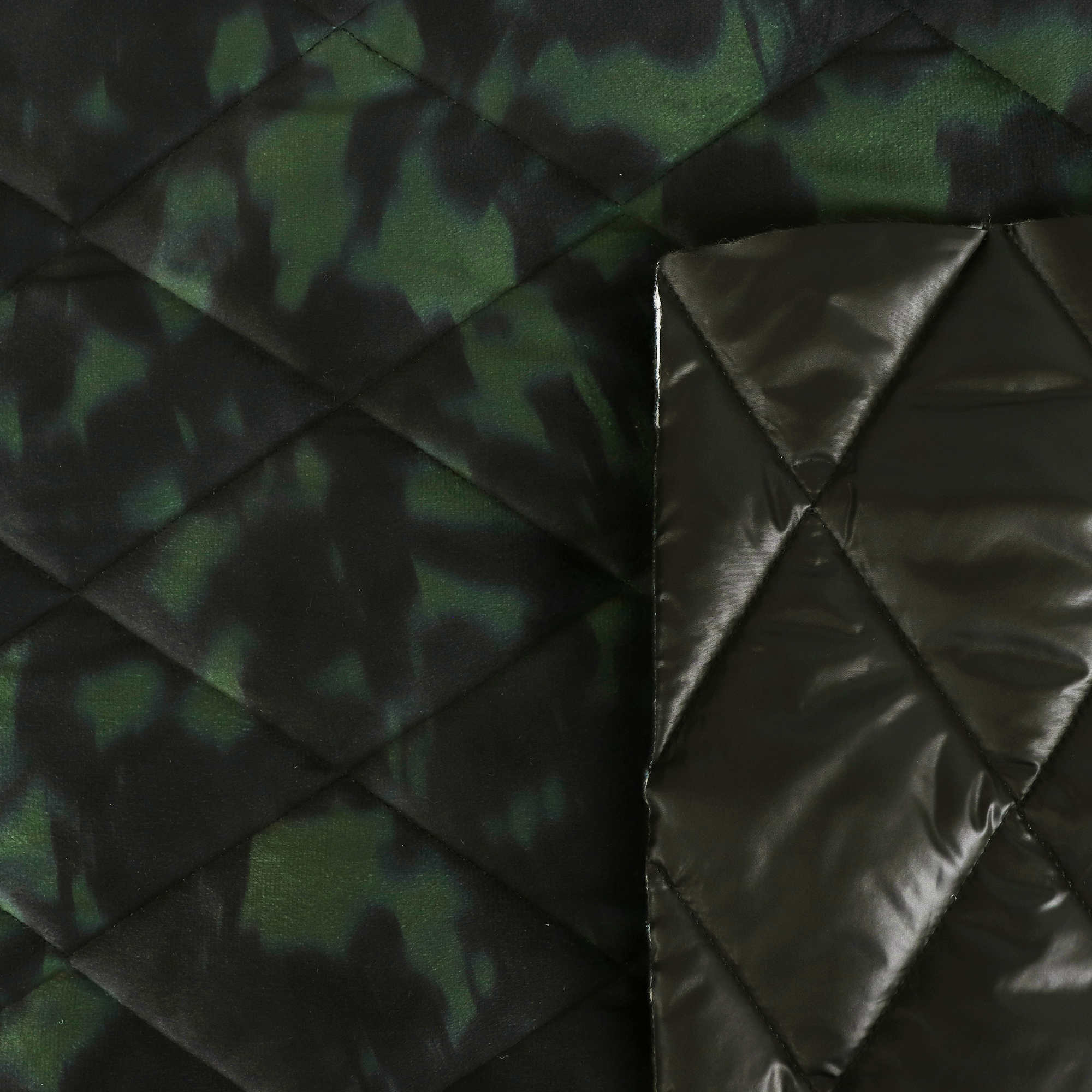 Quilted velvet coating would be perfect for sewing yourself a lightweight jacket or waistcoat, patterns such as the Hovea by Megan Nielsen or the Emmi by Papercut Patterns or the Wildwood Vest by Helen's Closet. This fabric is double sided - one side is a luxurious velvet fabric in a green and black camo inspired design, and the other side is a plain water resistant polyester lining in a black colour. Sandwiched between the two fabrics is polyester wadding. The two fabrics and wadding have been quilted together using a classic diamond pattern.