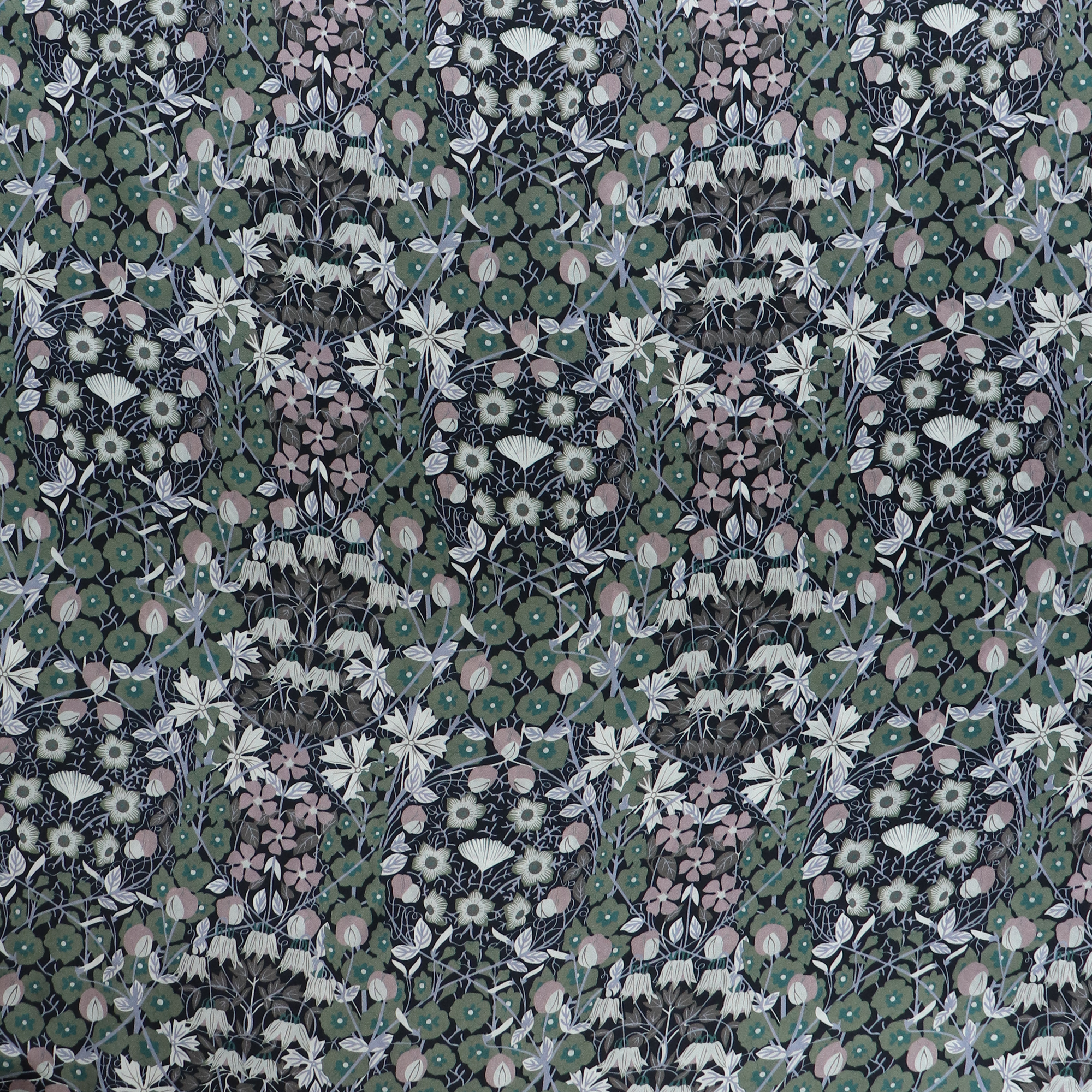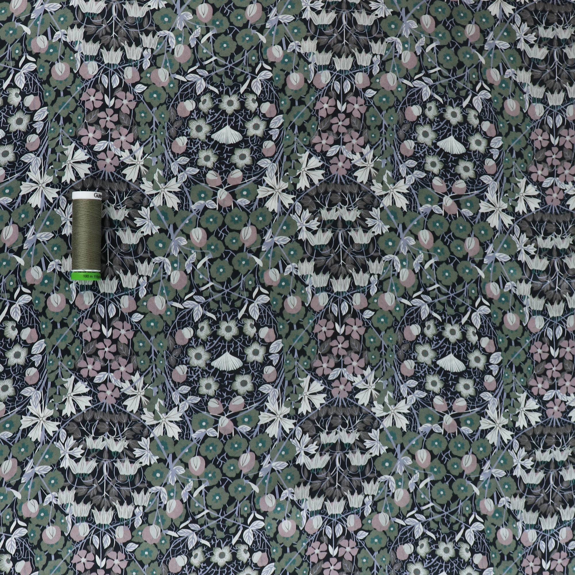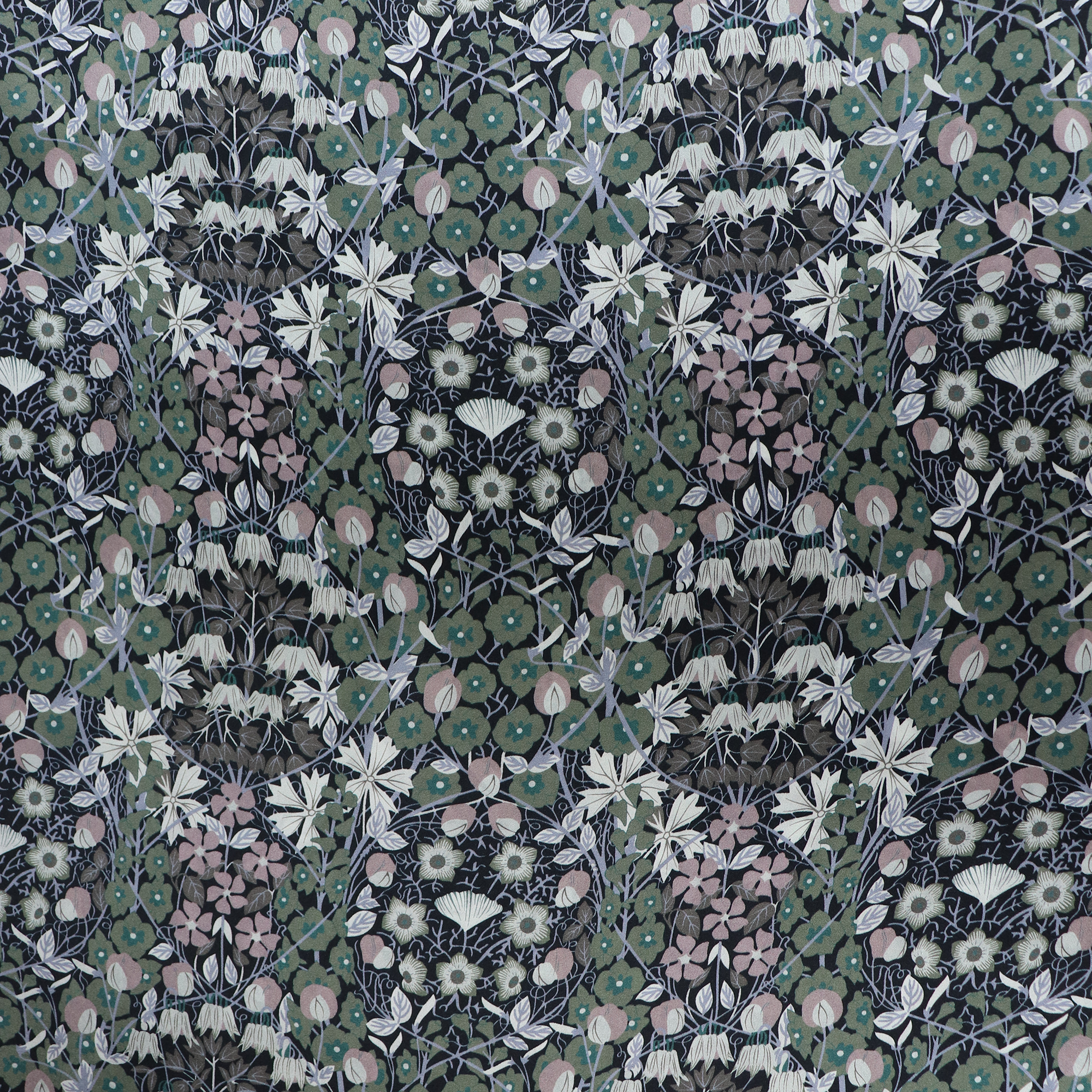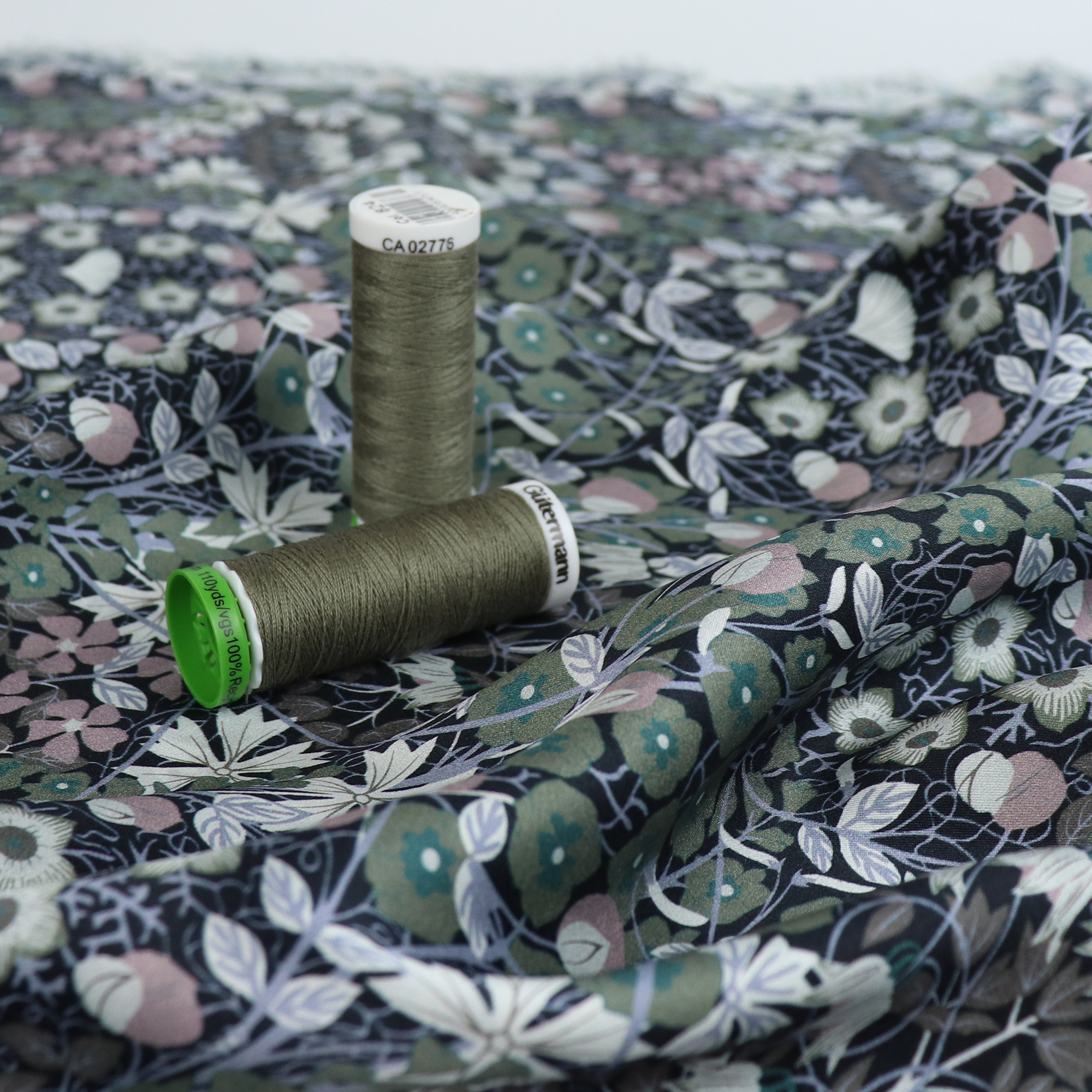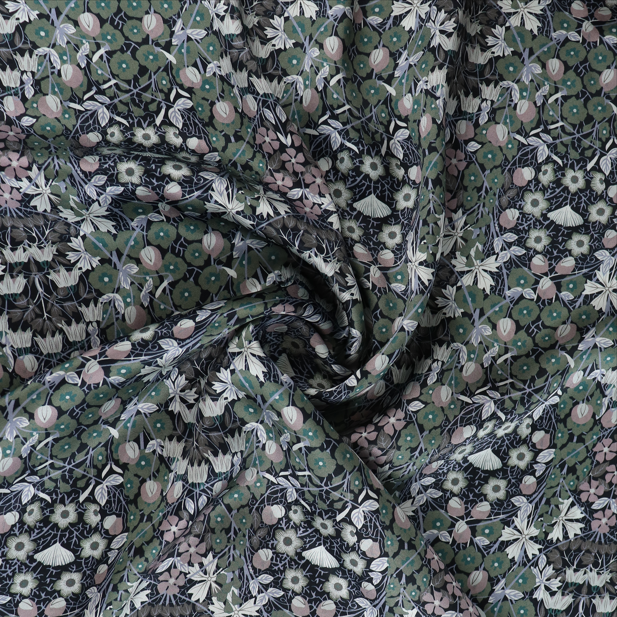 Silk satin dressmaking fabric has a beautiful sheen giving it a luxurious look. This pure silk fabric features a dark background and features a floral design in green, mauve and lilac. The fabric is lightweight an has a fluid drape making it ideal for bias cut skirts, cami tops, slip dresses, or luxurious nightwear.