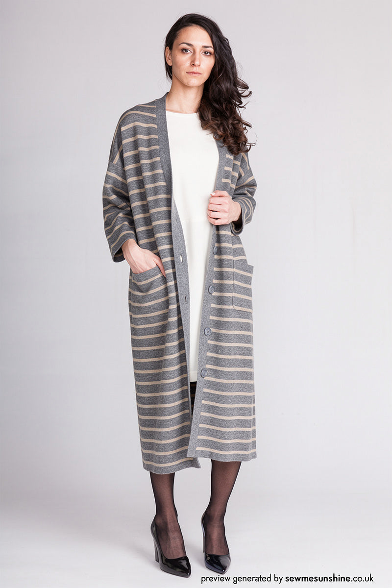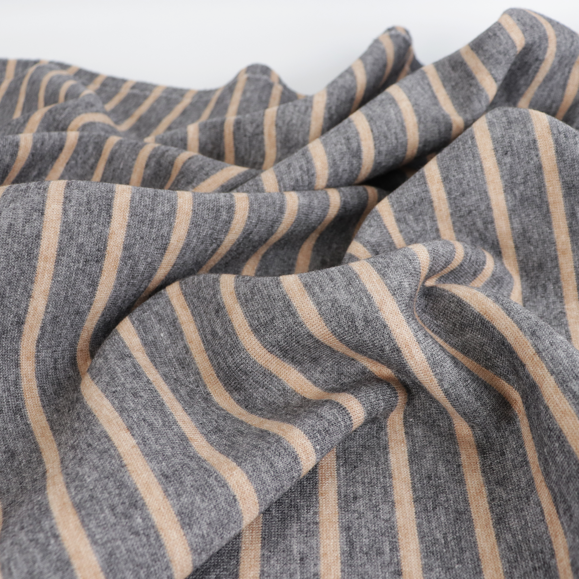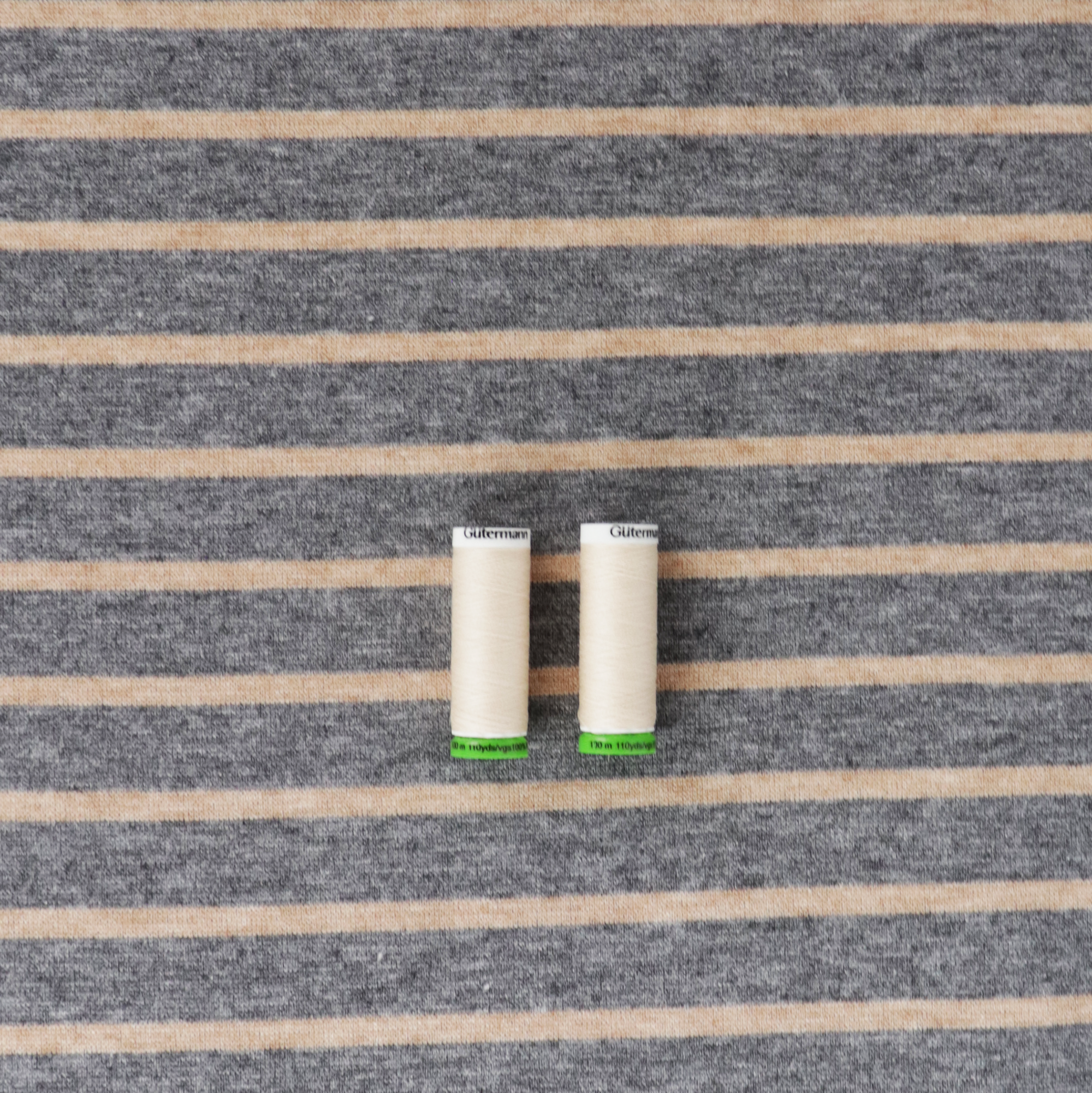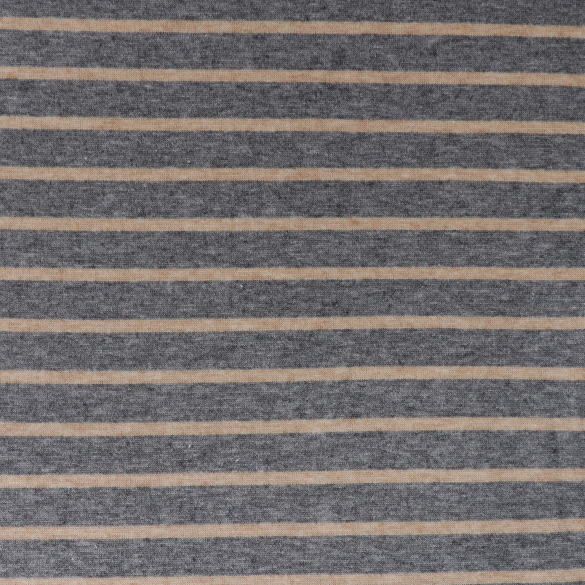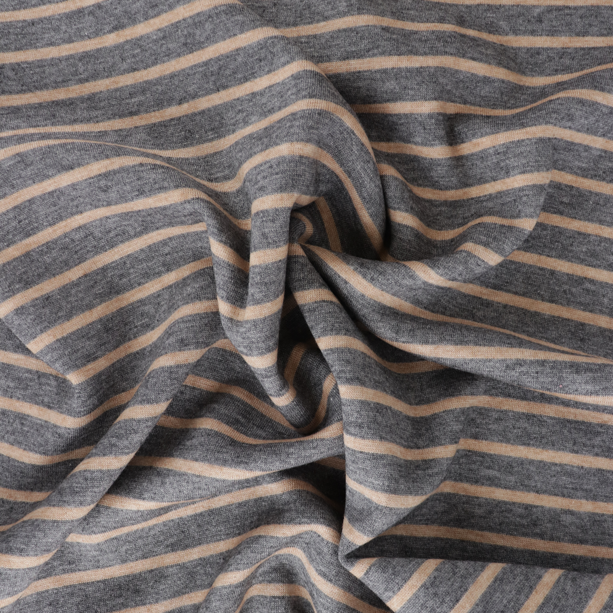 Viscose blend knit is thick and soft. It features an oatmeal stripe design that was created during the weaving process, the stripes run perpendicular to the selvedge. The fabric is a medium to heavy weight and has a moderate drape. It would look great made up into a relaxed sweatshirt or cardigan, (patterns: Named Esme Cardigan + True Bias Marlo).