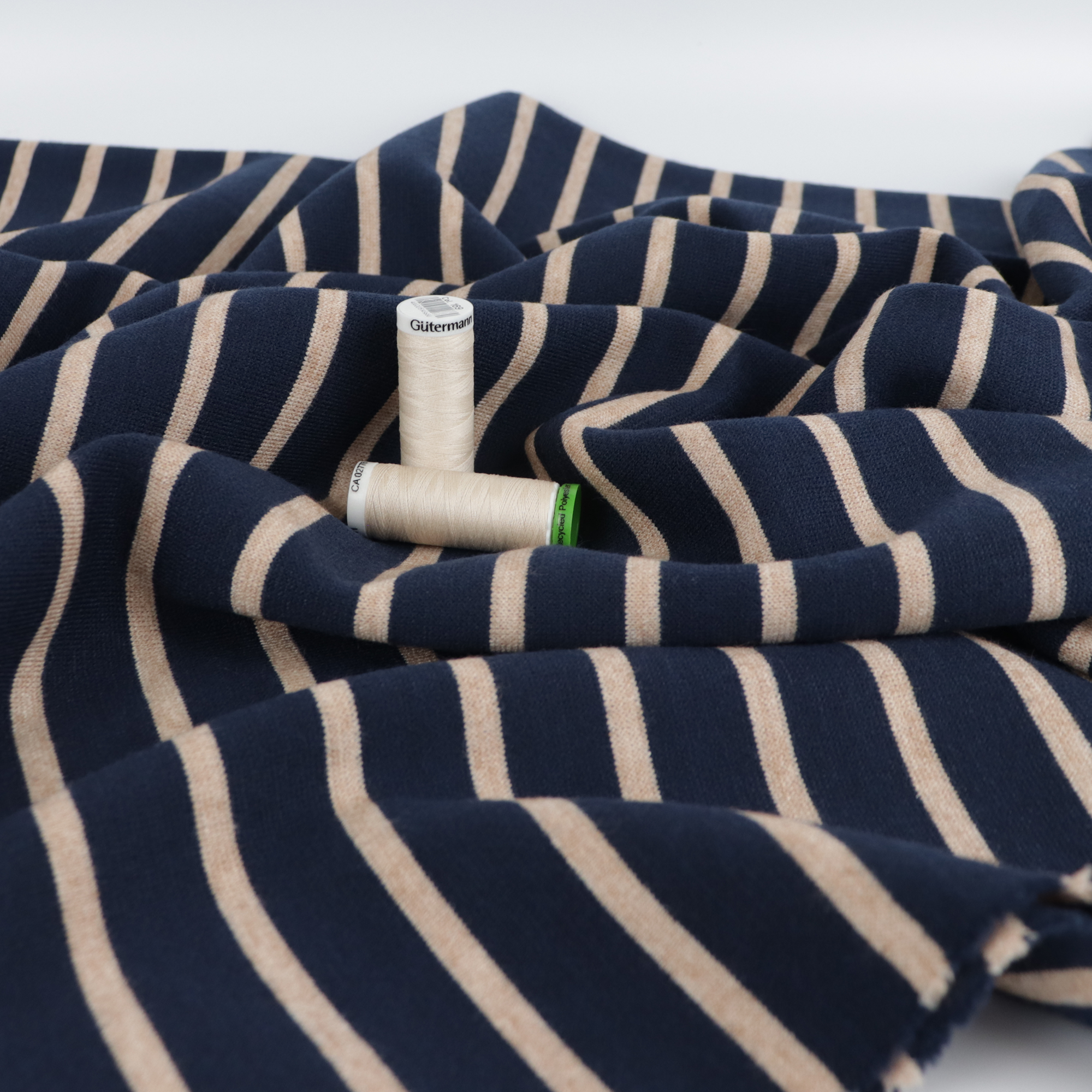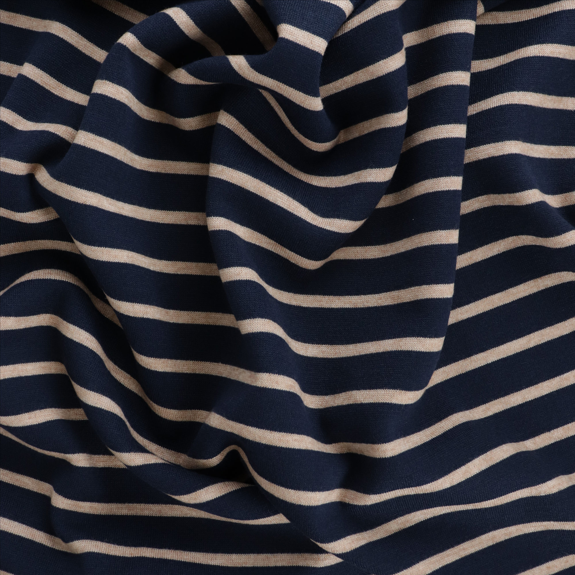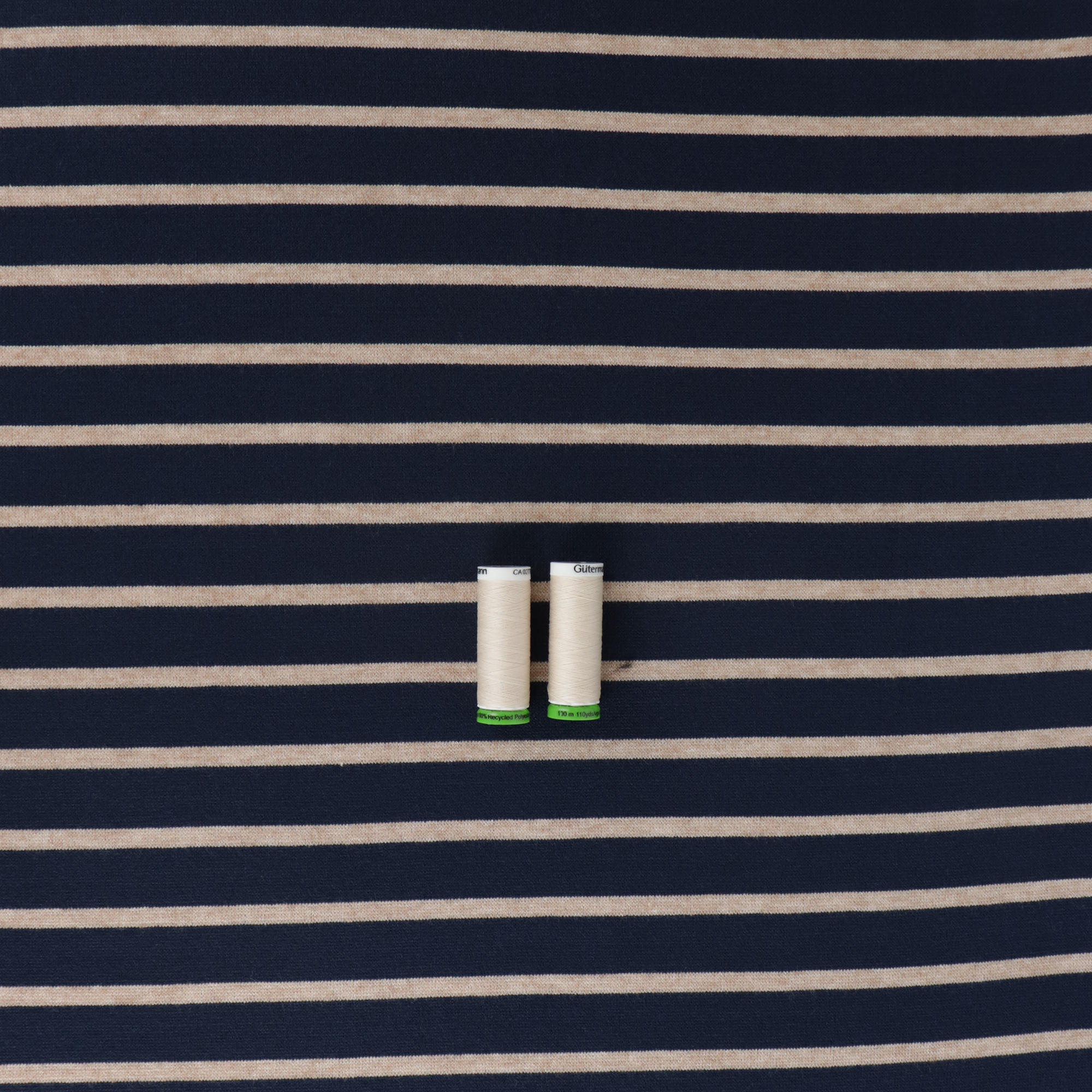 Viscose blend knit is thick and soft. It features an oatmeal stripe design that was created during the weaving process, the stripes run perpendicular to the selvedge. The fabric is a medium to heavy weight and has a moderate drape. It would look great made up into a relaxed sweatshirt or cardigan, (patterns: Named Esme Cardigan + True Bias Marlo).