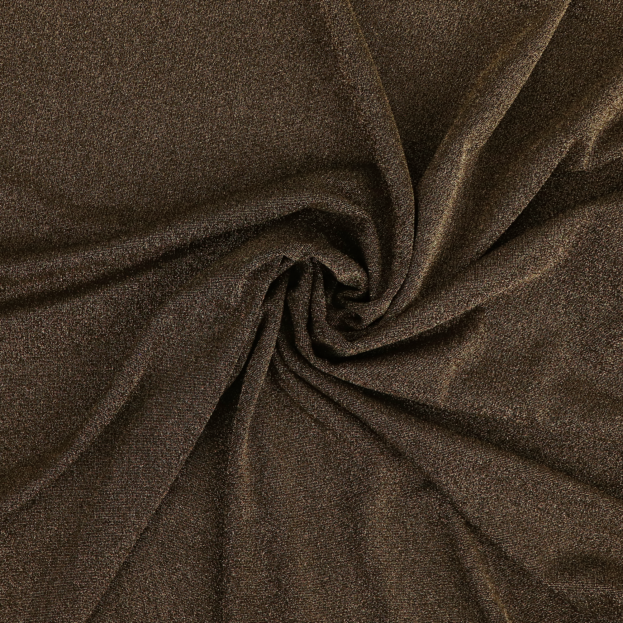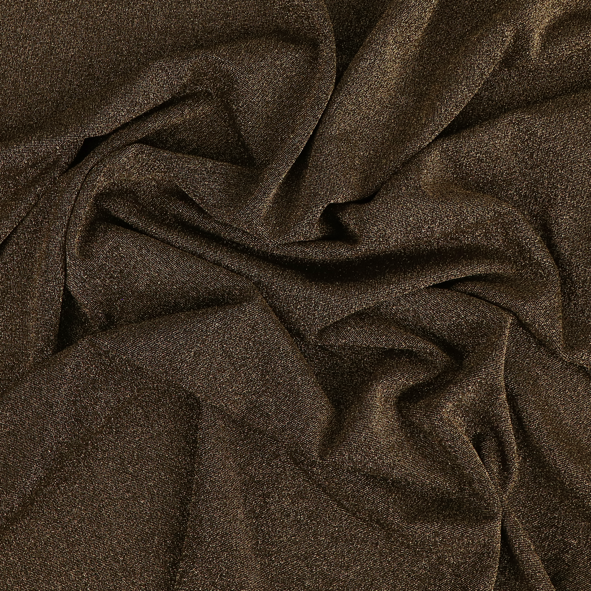 Metallic jersey fabric features a metallic deep gold colour. It has a smooth surface on the wrong side. It has a great 4 way stretch and recovery. It would look great sewn up into a simple jersey tee or rolled neck top, or you could sew yourself a dress or jumpsuit where the sewing pattern recommends a knit fabric.