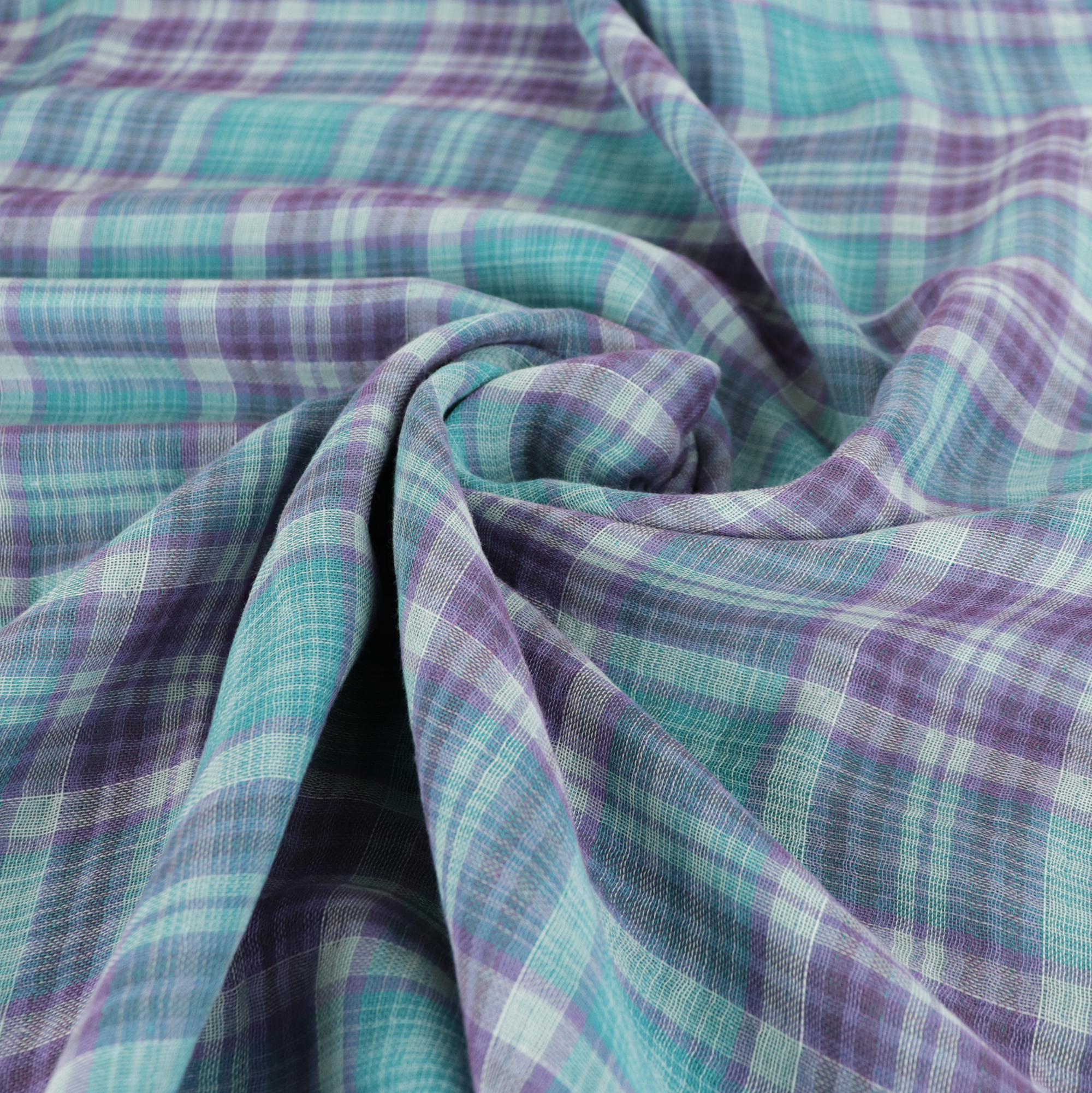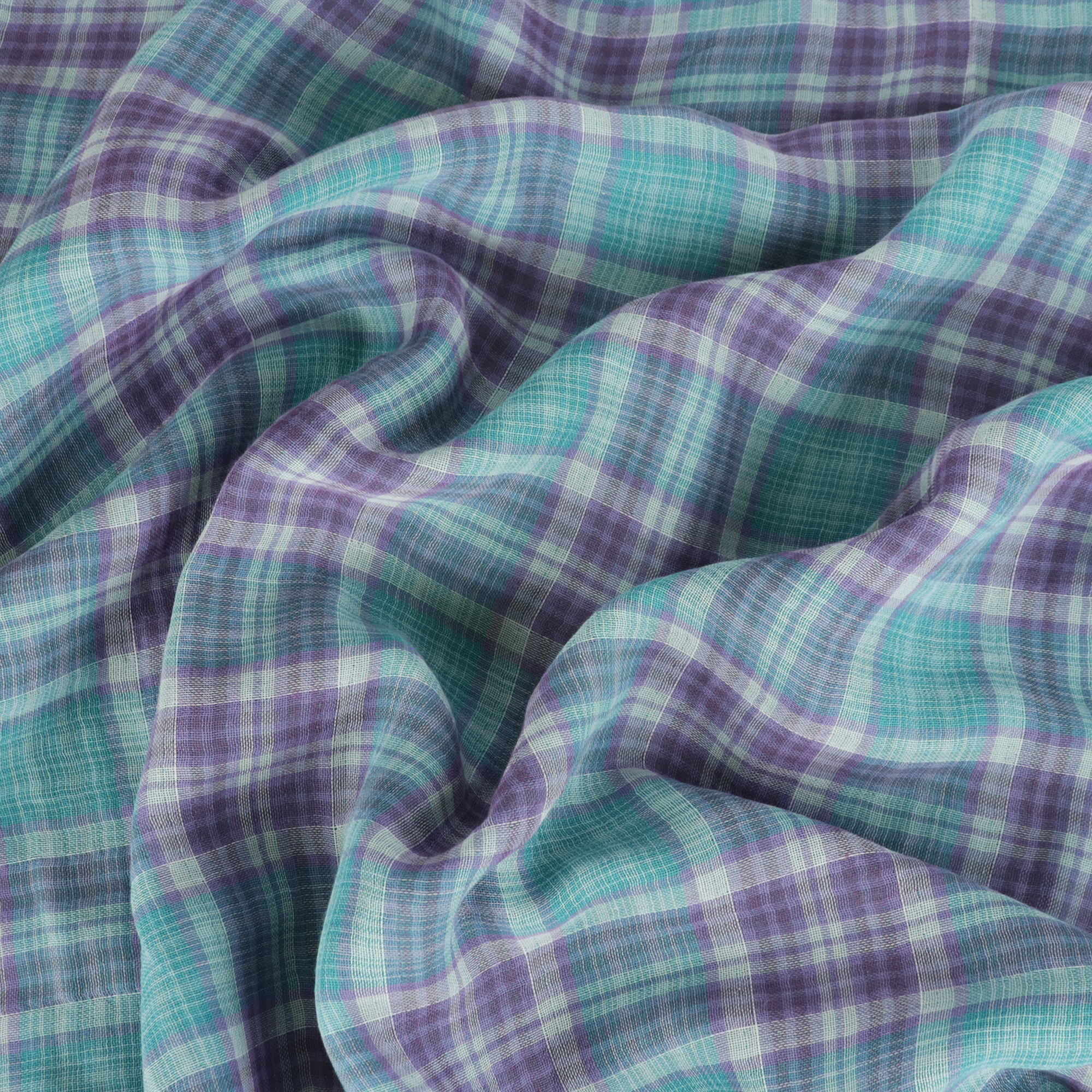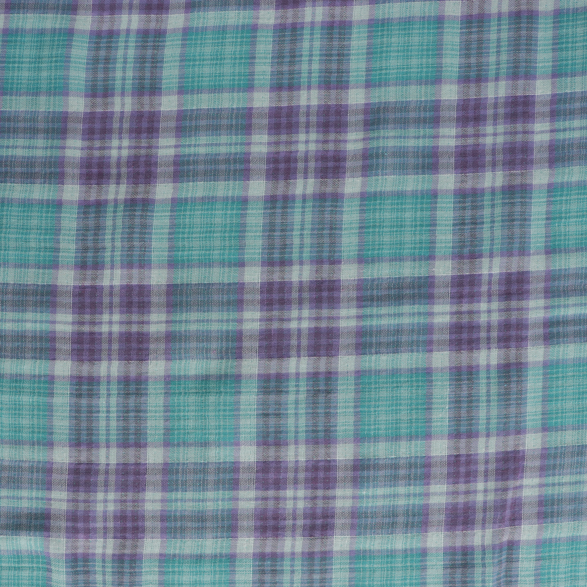 Double cotton gauze is lightweight, soft to touch and has a moderate drape. On one side it features a turquoise background with a purple and white check design, and on the other it is a plain turquoise. It would be perfect for sewing a top such as theTilly and the Buttons Stevie orThe Sagebrush Top by Friday Pattern Company.