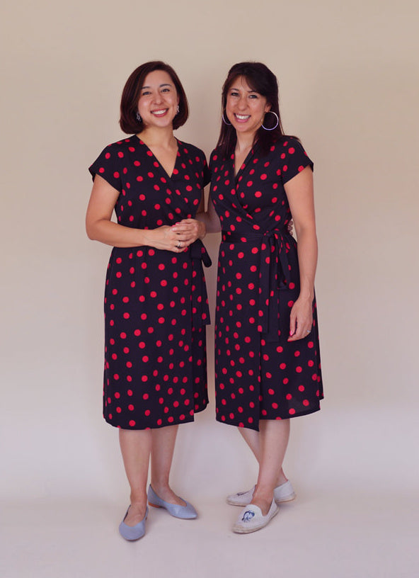 Deadstock viscose jersey has a black background and is covered in raspberry red polka dots (each polka dot measures approximately 2cm). This high quality viscose jersey would be ideal for sewing yourself a jersey dress or top. Such as the Nina Lee Mayfair Dress (see image of it made up using our new preview fabric feature).