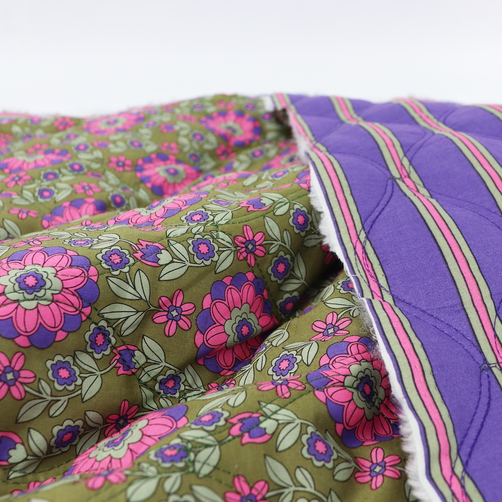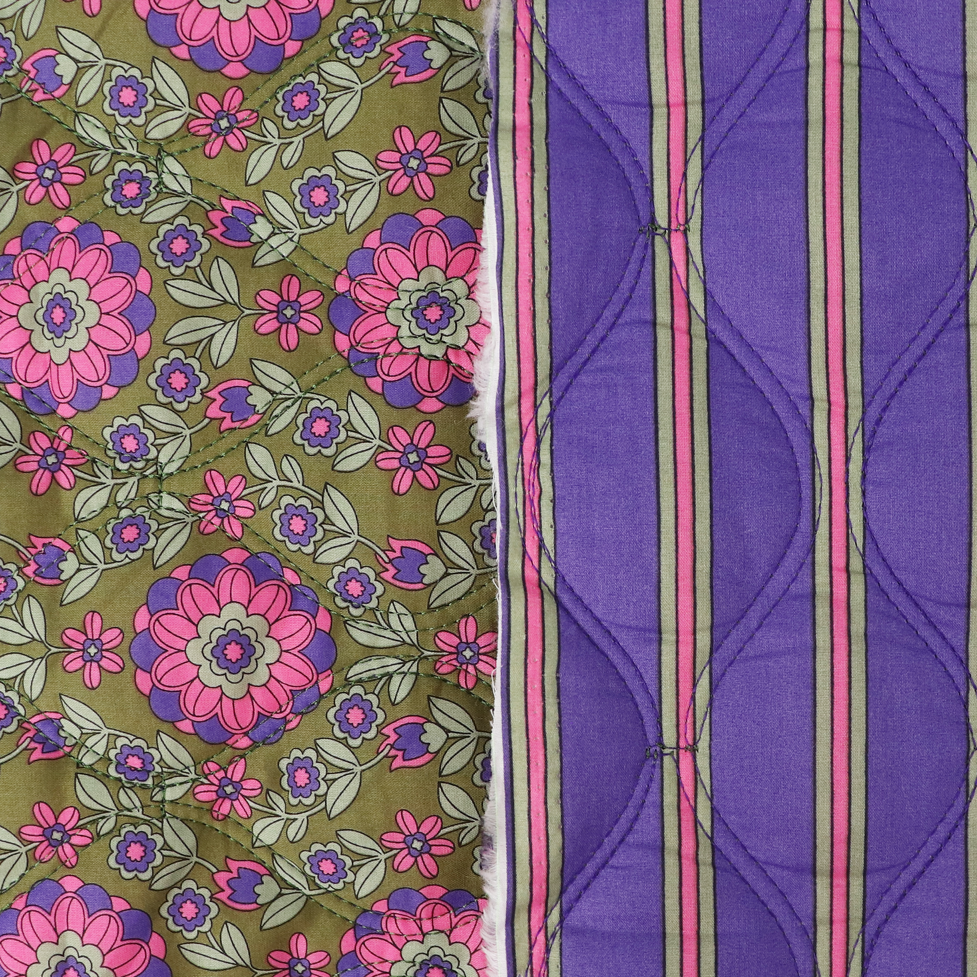 Quilted fabric features printed cotton voile on each side with polyester wadding sandwiched between the two layers. Each cotton fabric features a complimentary but contrast design - one side features a green background with a floral design and the other side features a purple background with a stripe design. You could incorporate both sides in your chosen project or choose your favourite. It would look great sewn up into a jacket, gilet or a bag.