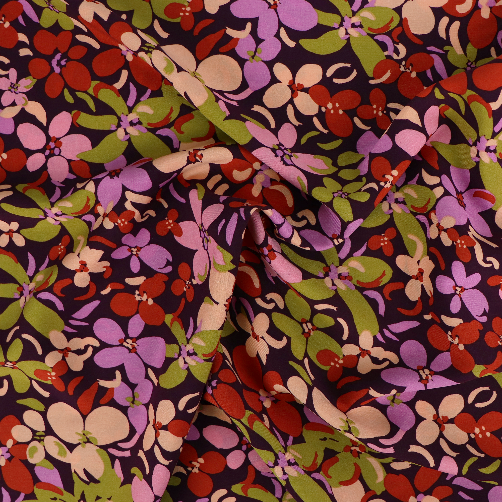Viscose lawn is soft against the skin and has a fluid drape. It has a purple coloured background and is covered in a floral design featuring oranges, greens and pinks. It is perfect for sewing yourself a blouse, floaty dress or skirt.