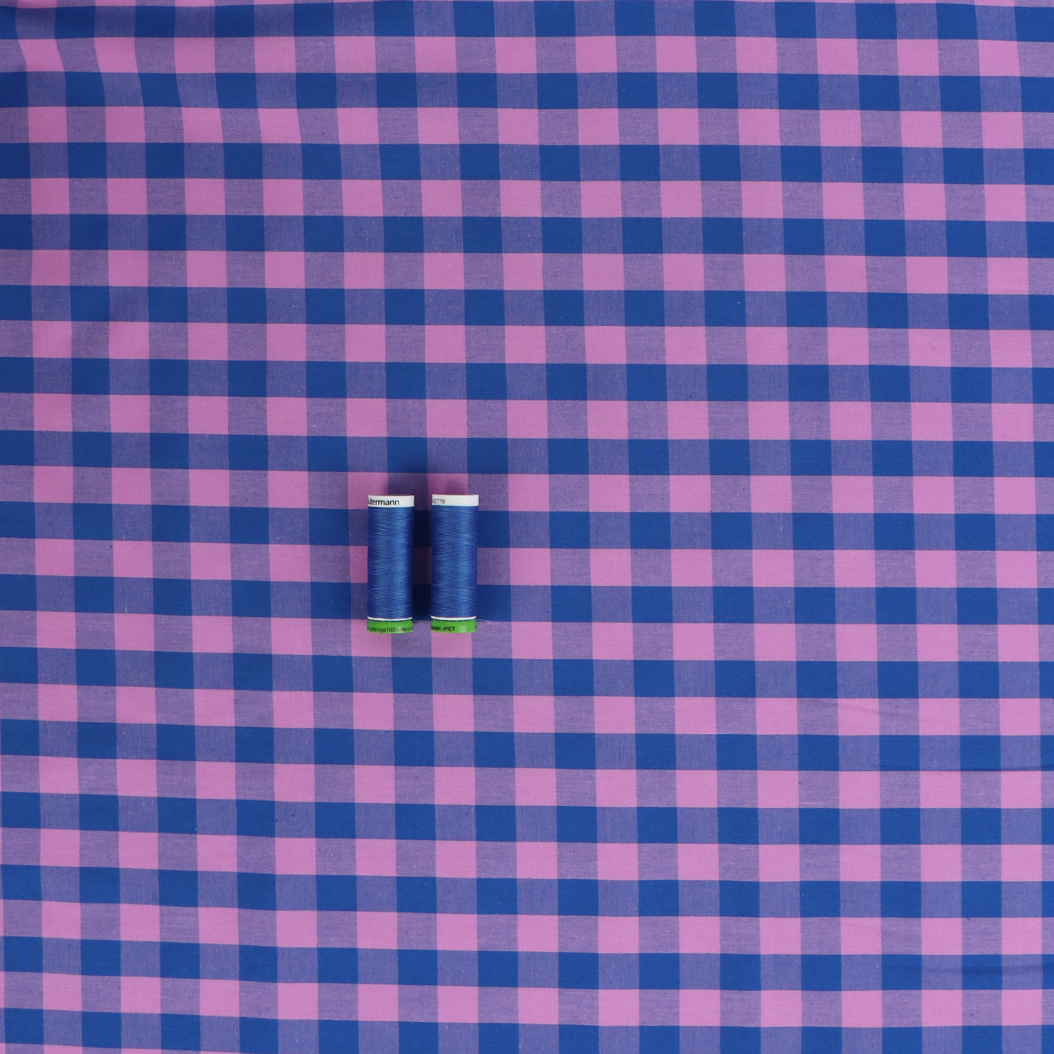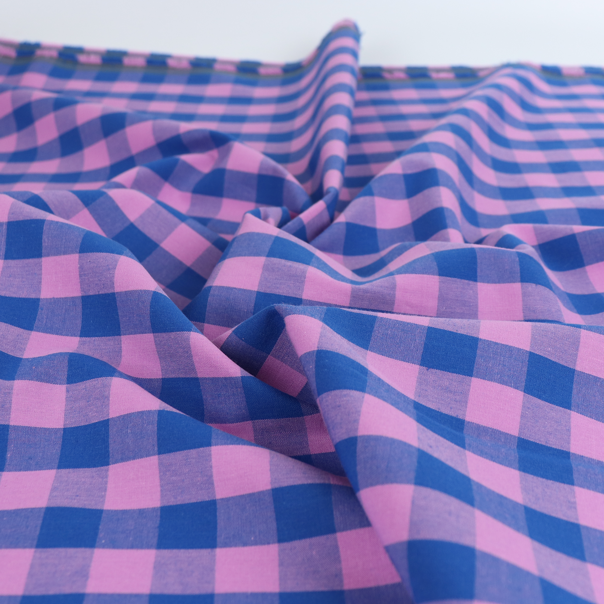 Yarn dyed cotton shirting features a gingham design in a pink lilac and blue. Each check is approximately 15mm x 20mm. The cotton fabric is soft to touch and has a moderate drape meaning that it holds pleats and gathers well. It would be perfect for sewing yourself a shirt, skirt, dress, blouse, pair of relaxed wide legged trousers or even a pair of pyjamas. Patterns such as the Archer Shirt by Grainline Studio or a Marnie by Tilly and the Buttons.