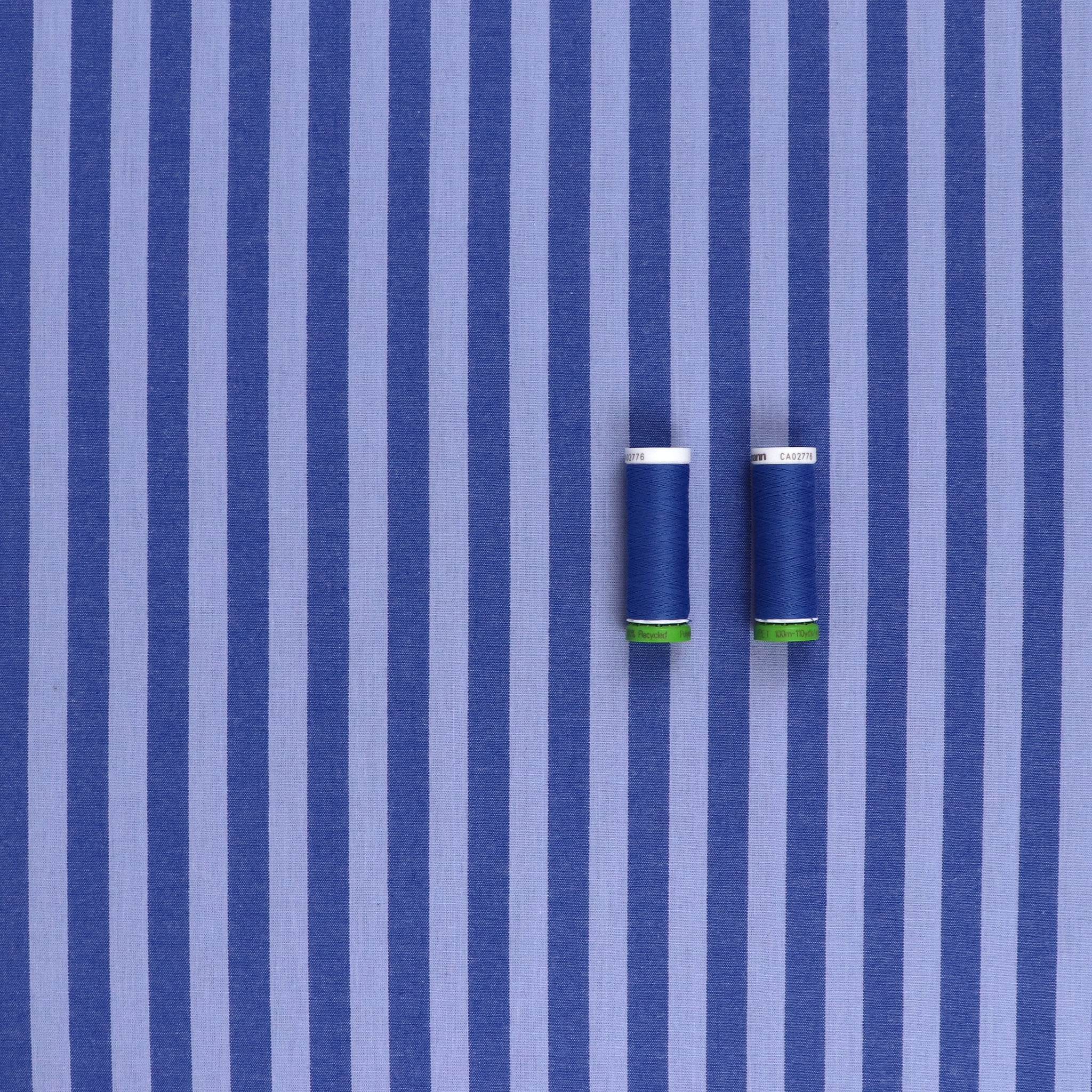 Yarn dyed cotton has a lighter blue background and is covered in blue coloured stripes. The stripes have been created during the weaving process and run parallel to the selvedge. The fabric has a washed texture and feel. It would look great sewn up into a shirt, blouse, top, shirt dress, wide legged trousers and lots more.