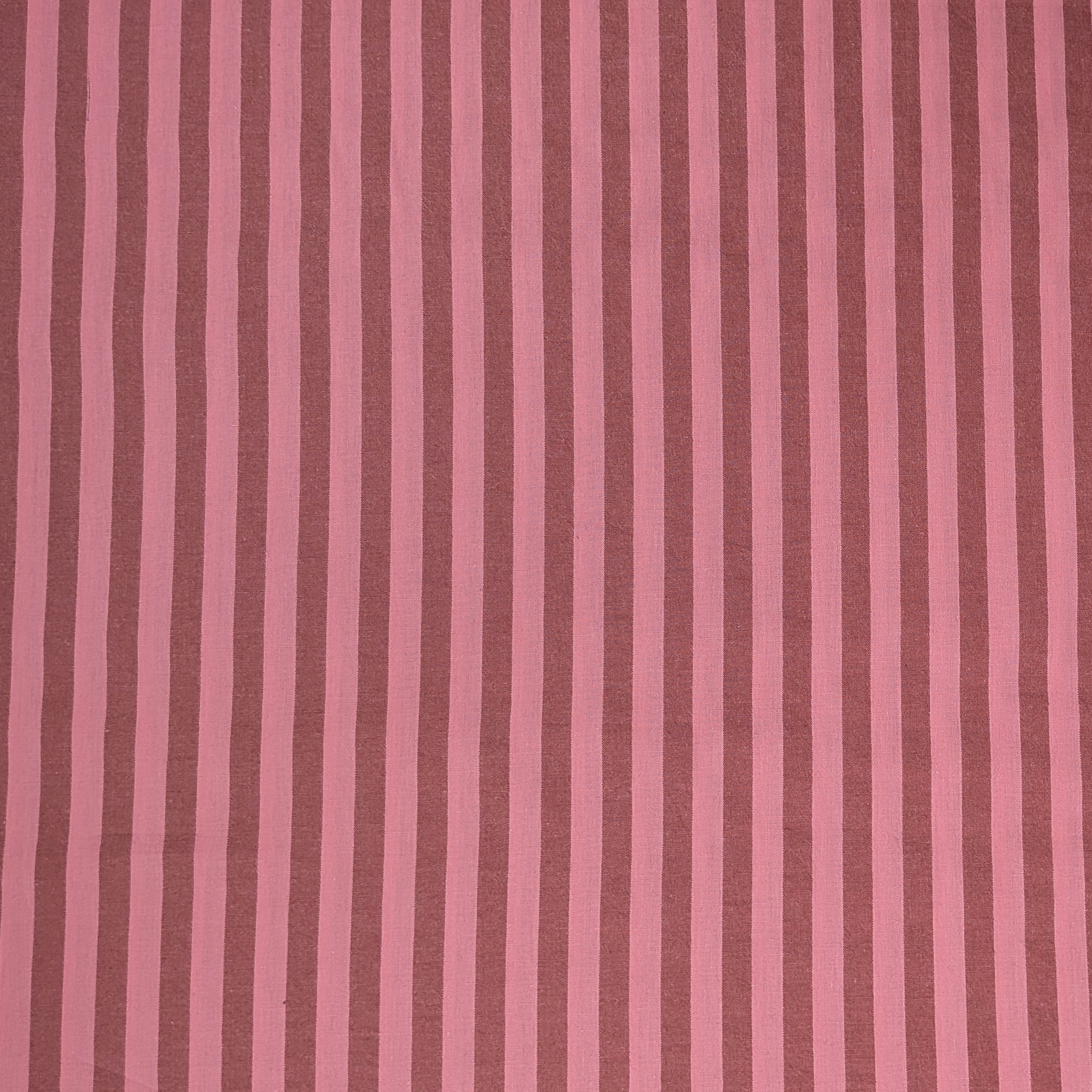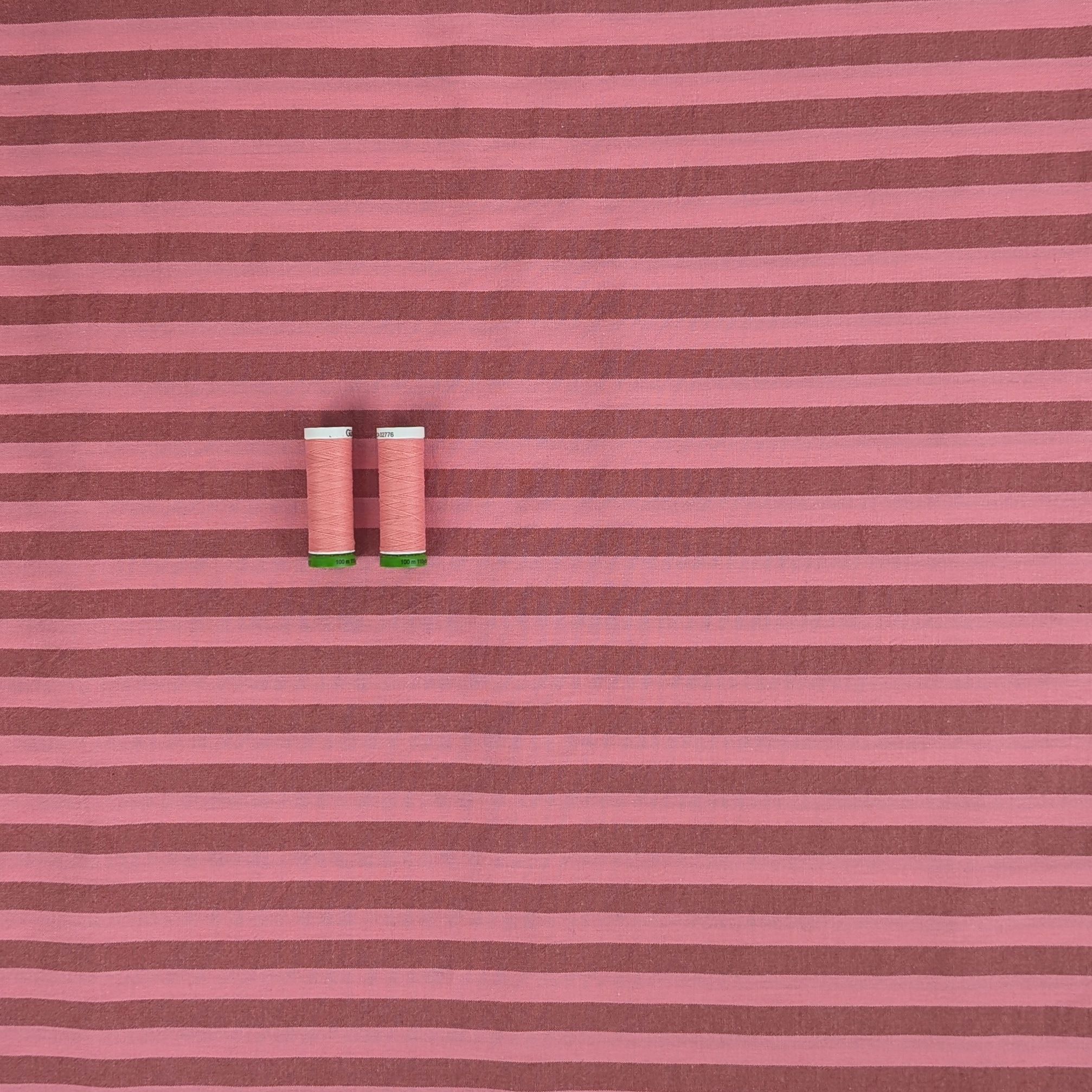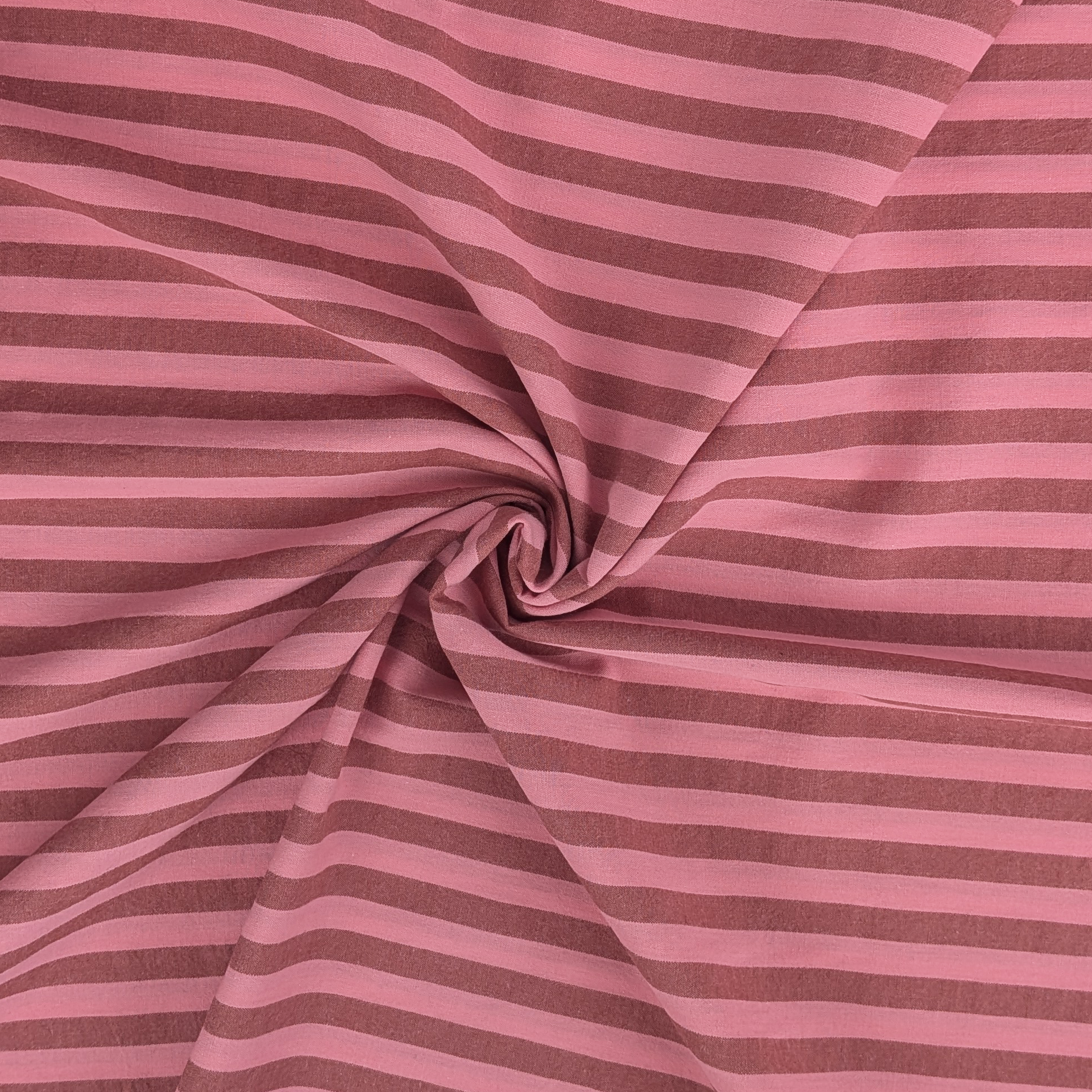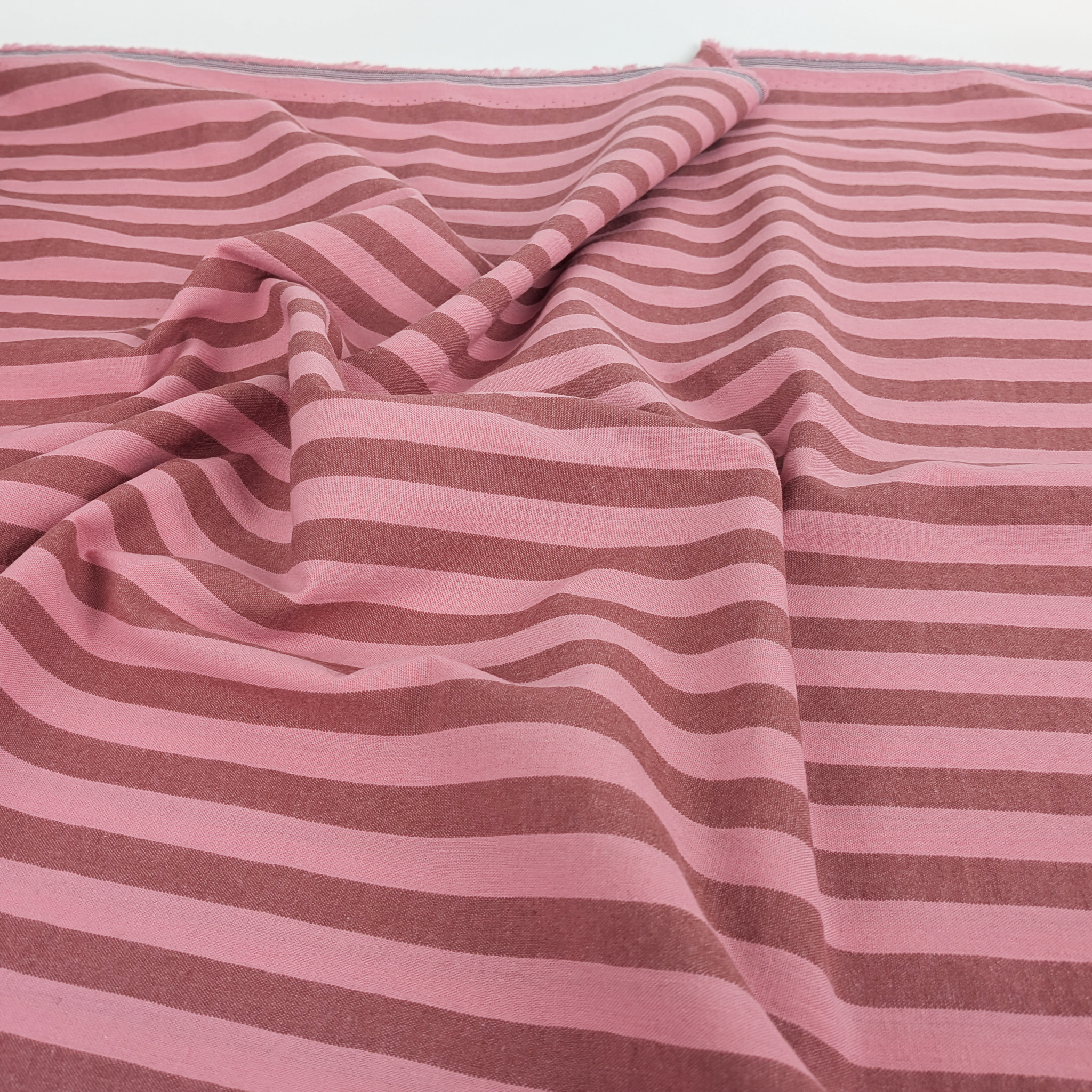 Yarn dyed cotton has a coral pink background and is covered in pink brown coloured stripes. The stripes have been created during the weaving process and run parallel to the selvedge. The fabric has a washed texture and feel. It would look great sewn up into a shirt, blouse, top, shirt dress, wide legged trousers and lots more.