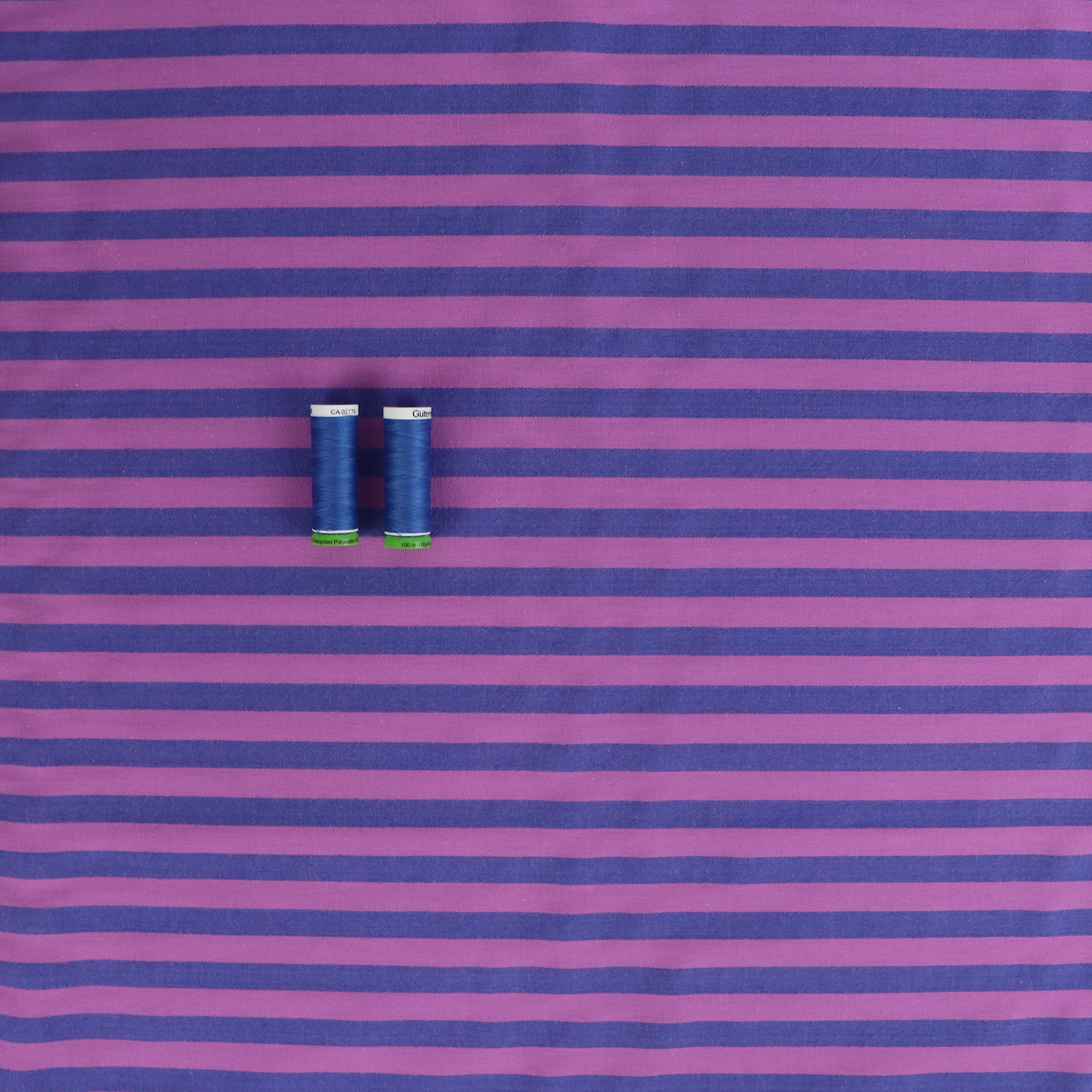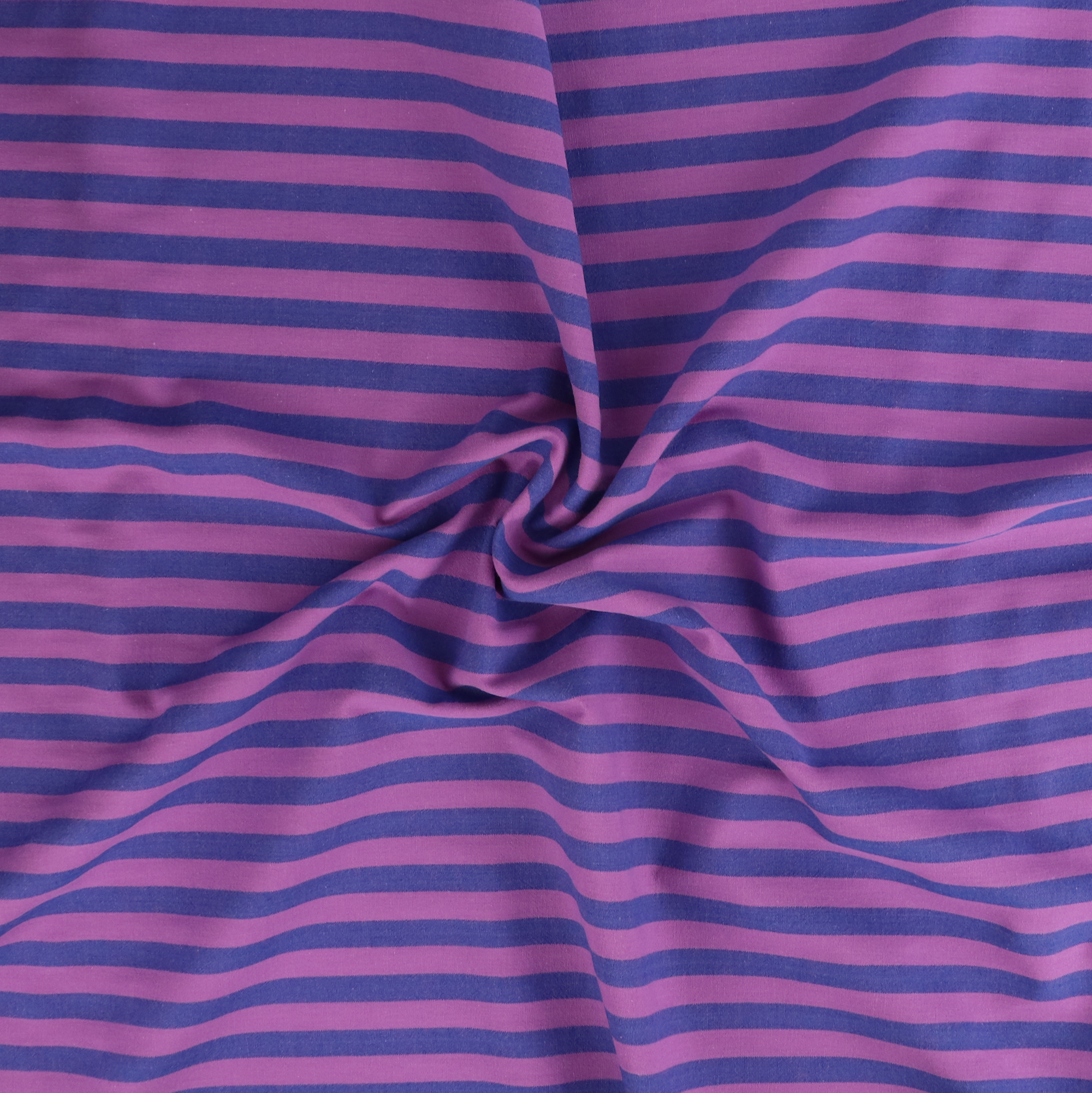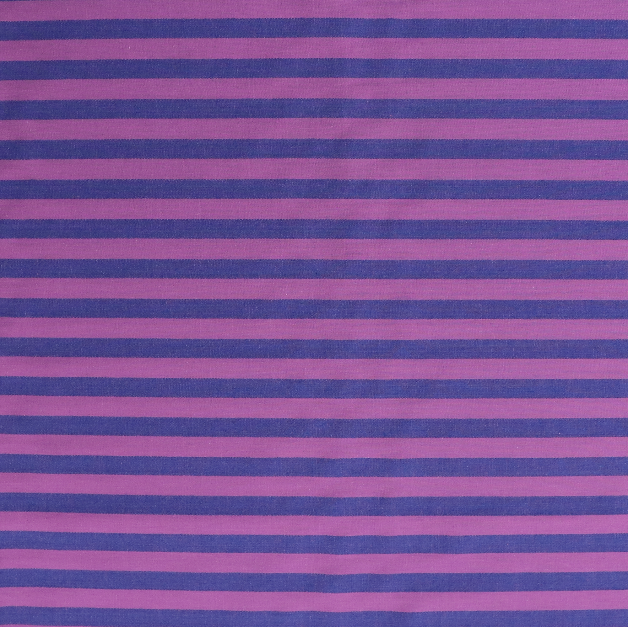 Yarn dyed cotton has a purple pink background and is covered in blue coloured stripes. The stripes have been created during the weaving process and run parallel to the selvedge. The fabric has a washed texture and feel. It would look great sewn up into a shirt, blouse, top, shirt dress, wide legged trousers and lots more.