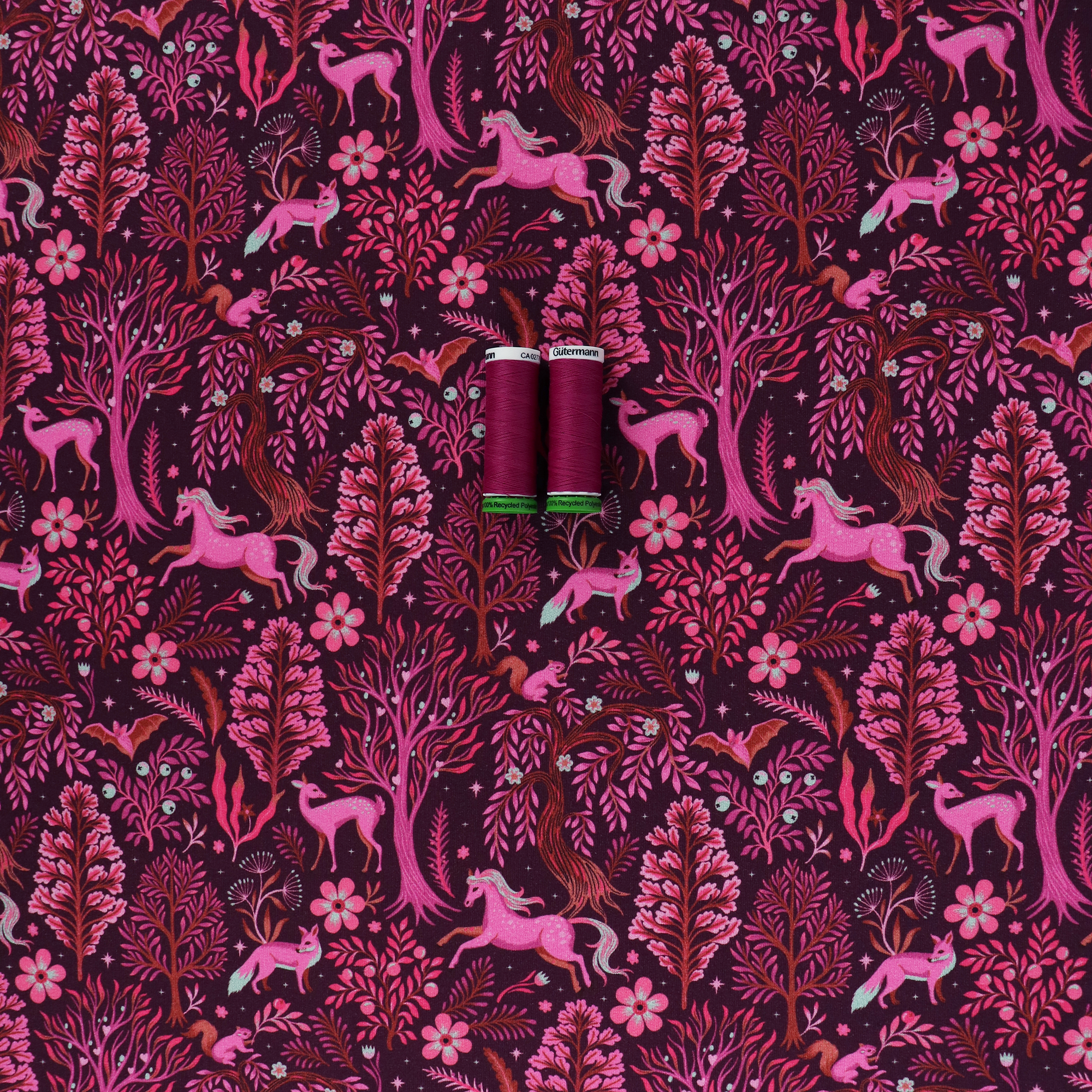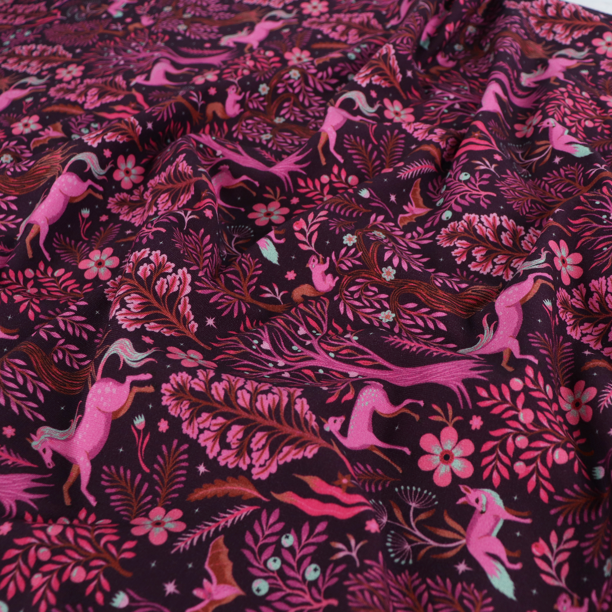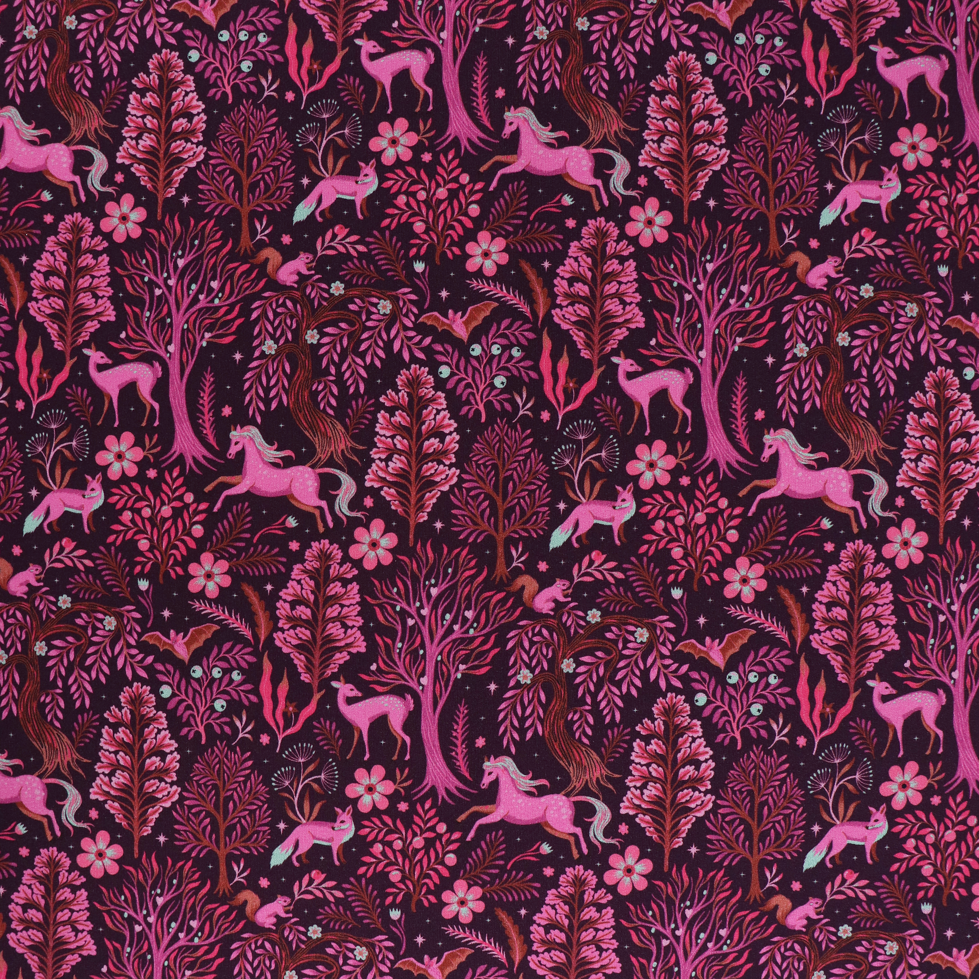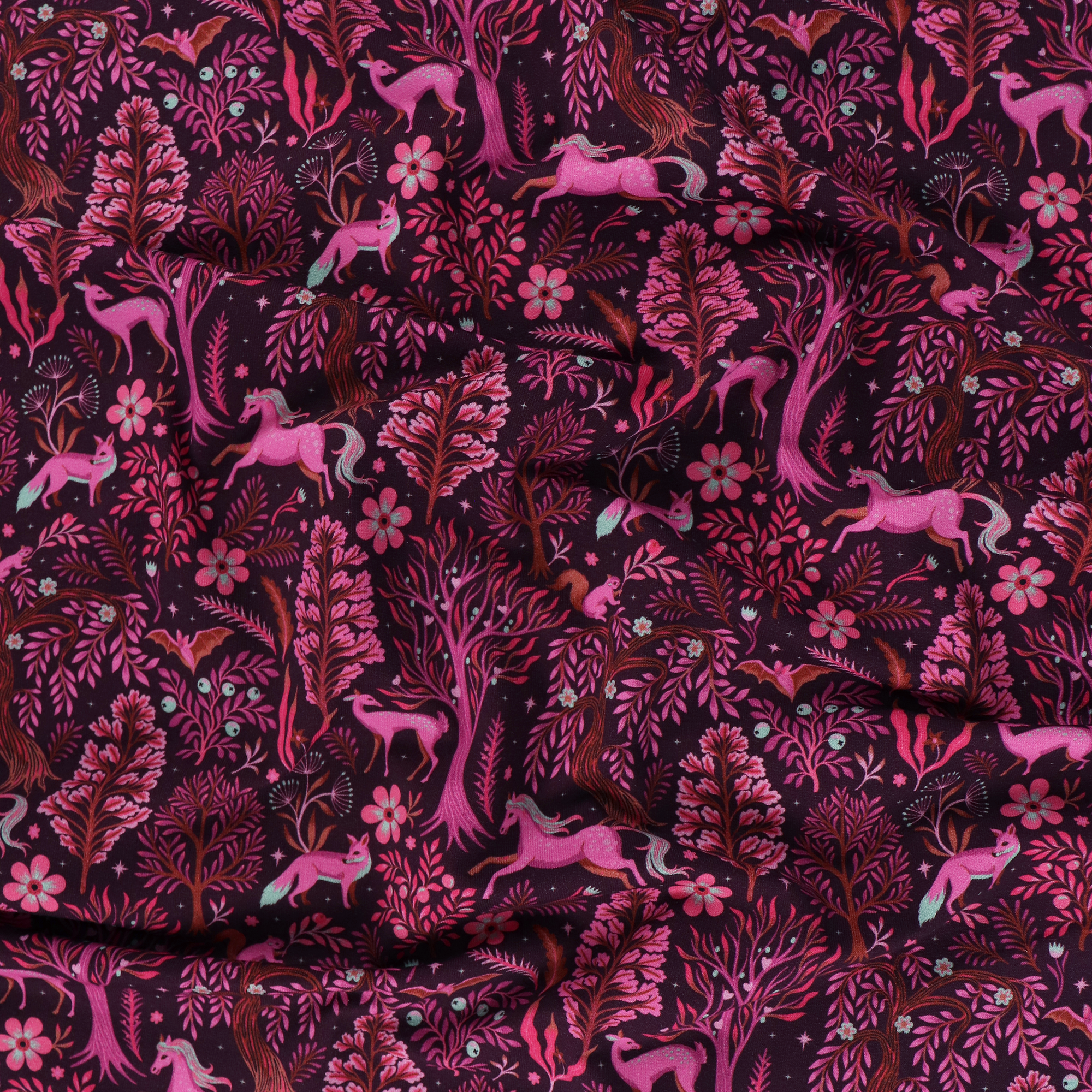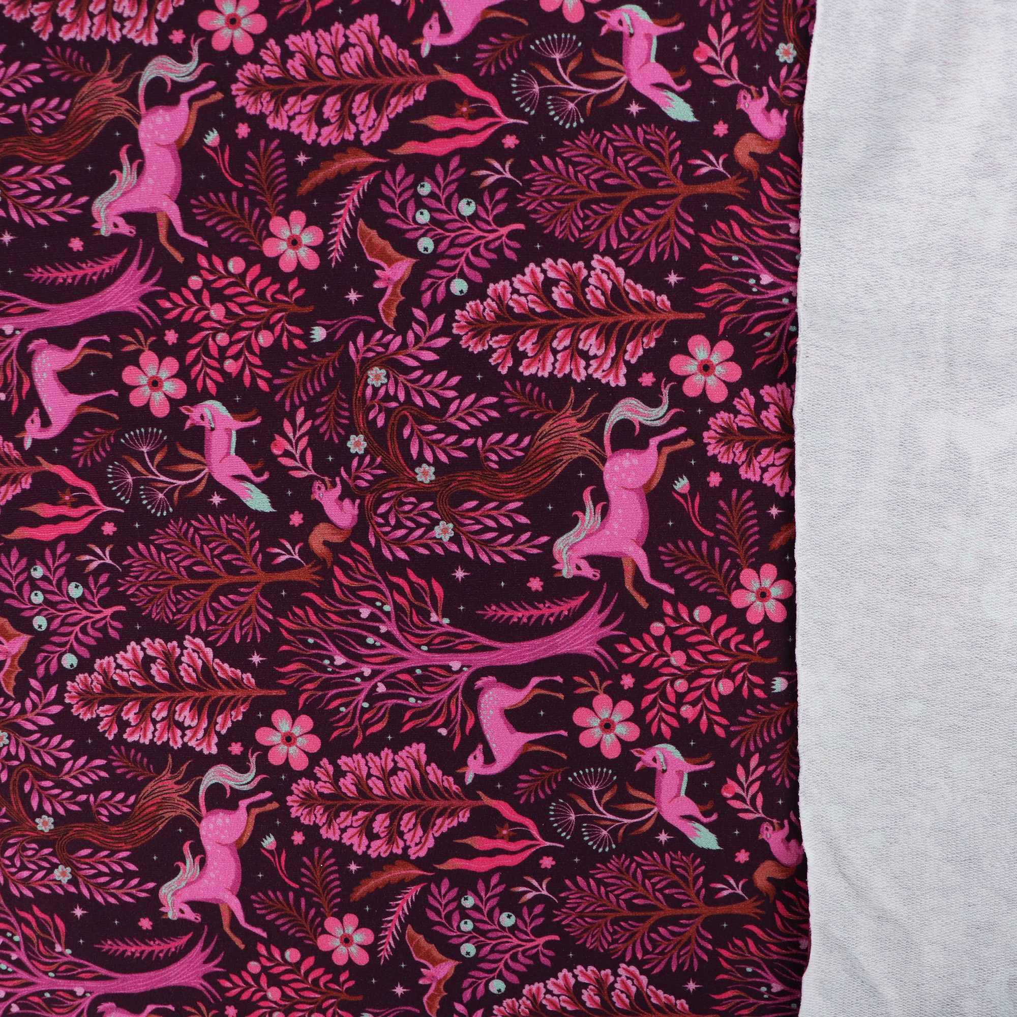 Cotton french terry jersey has a soft looped back. It has a deep burgundy coloured background and is covered in a magical forest scene in pinks and oranges. It would look great made up into a sweatshirt, cardigan or a pair of sweatpants.