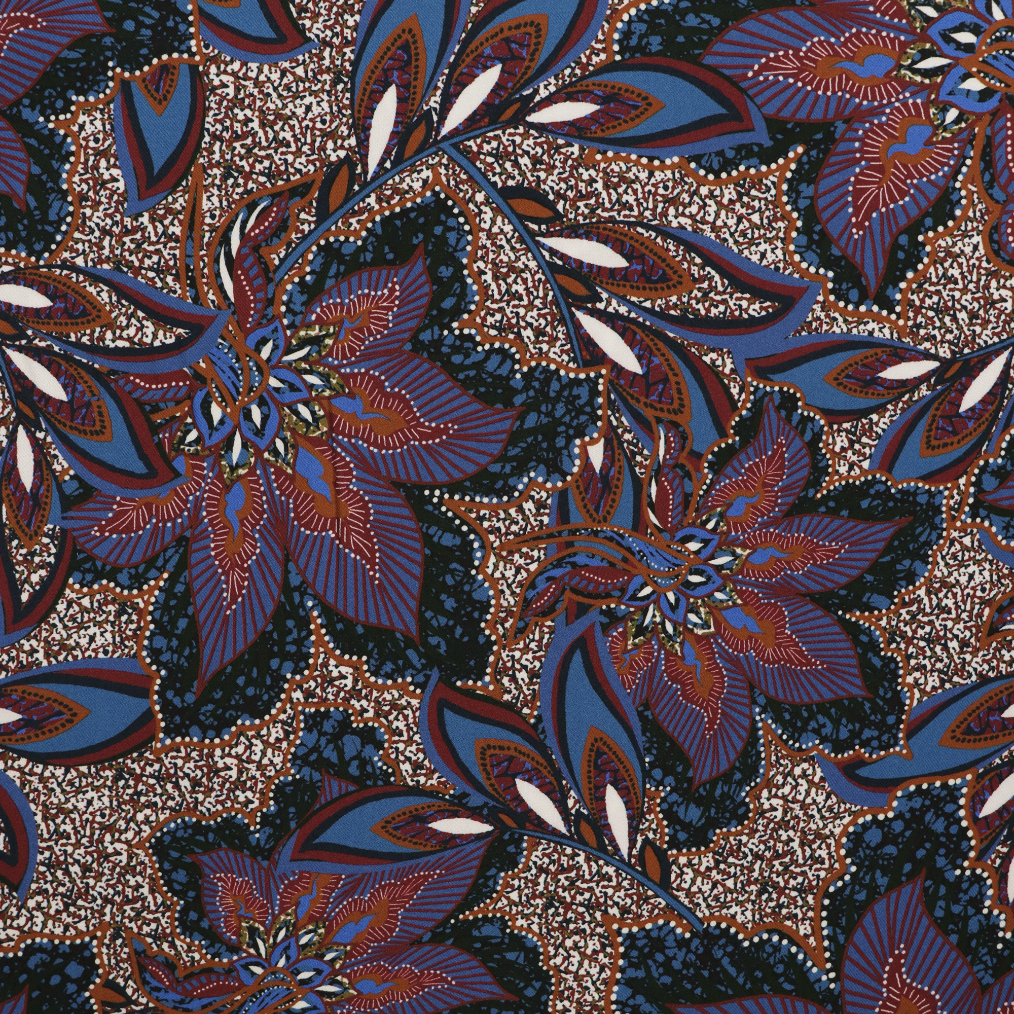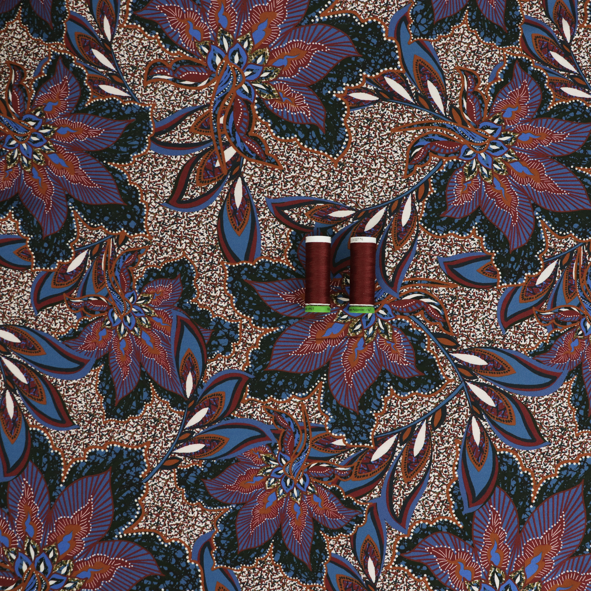 Deadstock viscose twill is covered in an unusual star leaf inspired design in browns, purples and blues. Being a viscose twill it is heavier than a viscose lawn but still has a fluid drape. It would be ideal for sewing yourself a shirt, shirt dress, floaty dress, skirt, wide legged trousers and more.