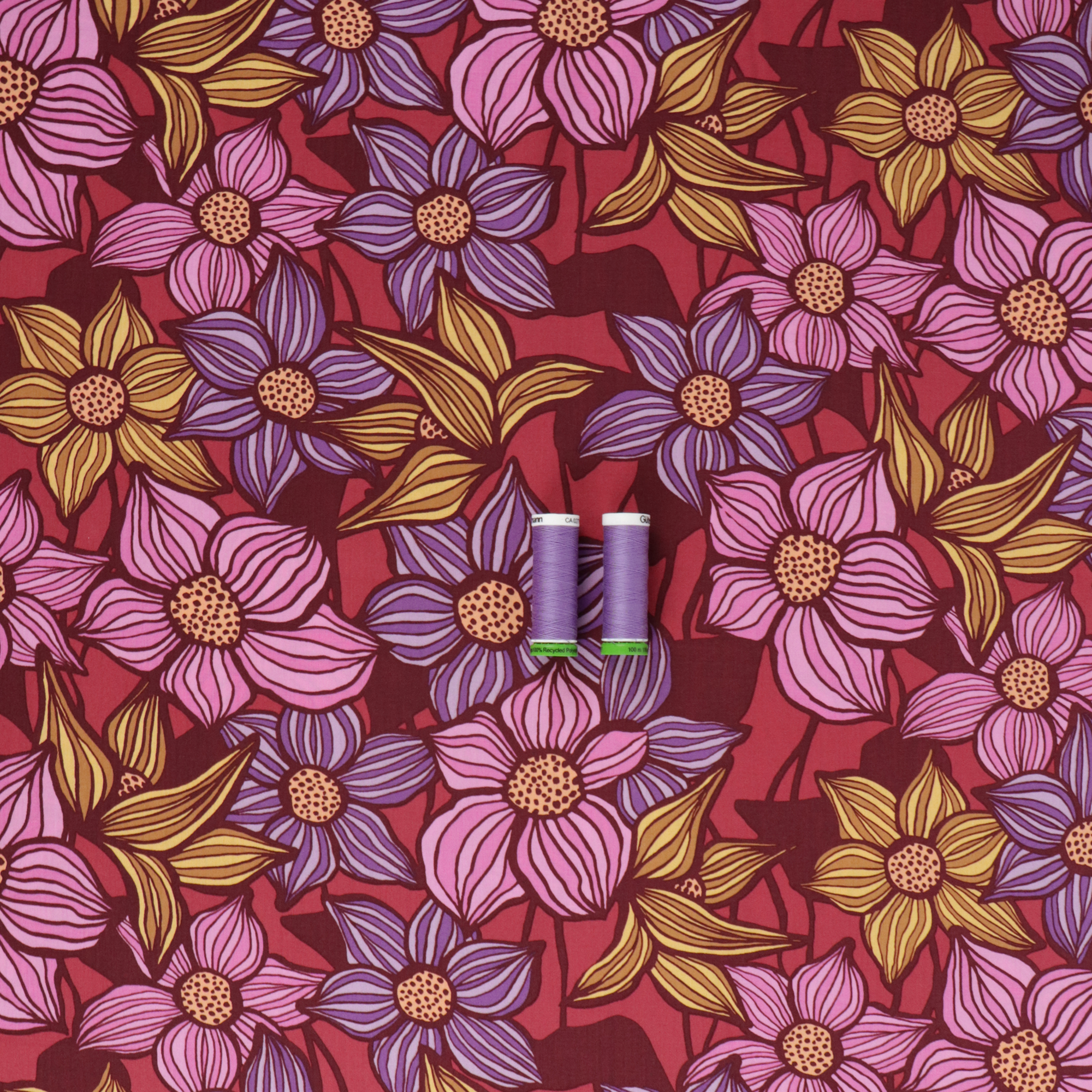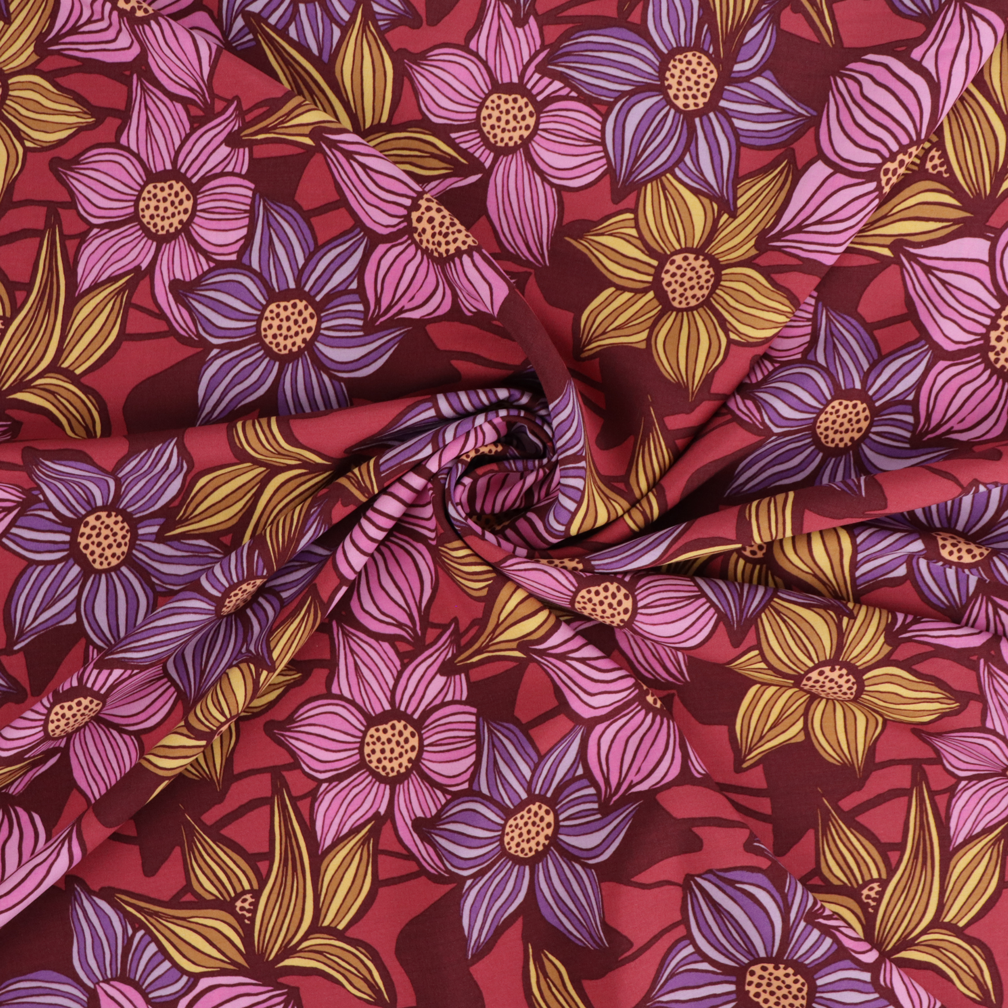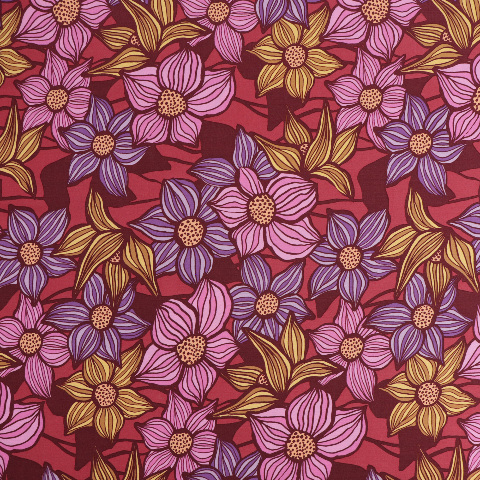 Viscose lawn dressmaking fabric has a fluid drape and is soft against the skin. It has a raspberry coloured background and is covered in a fun floral design in pink, purple and yellow. It is ideal for floaty blouses, dresses and skirts.