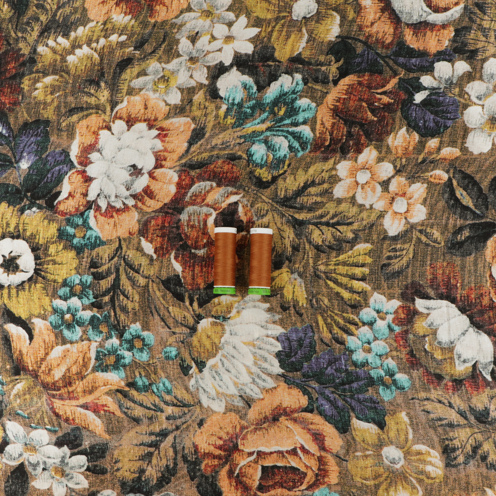 Viscose satin dressmaking features a light brown background and is covered in a statement floral design. It has a subtle luxurious sheen. The fabric has a good drape and weight making it ideal for dresses, blouses, skirts and even wide legged trousers.
