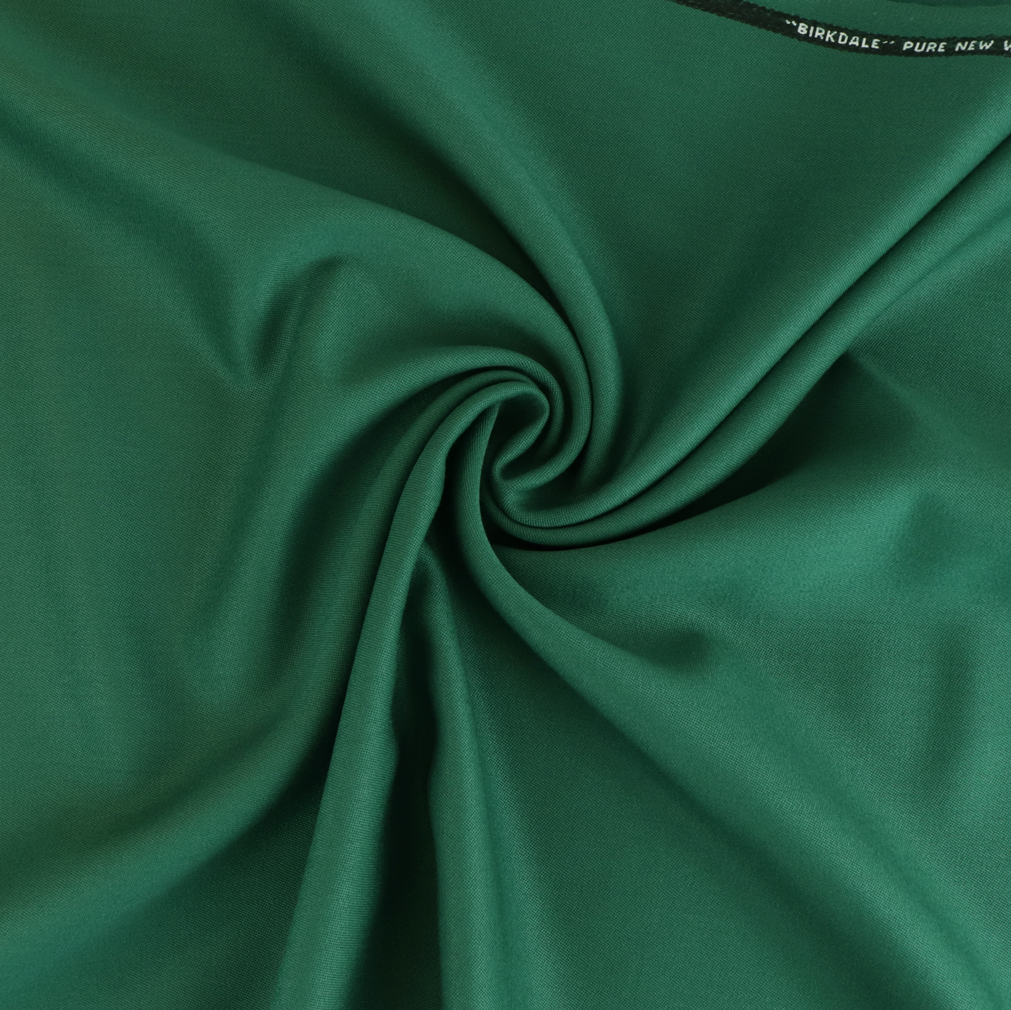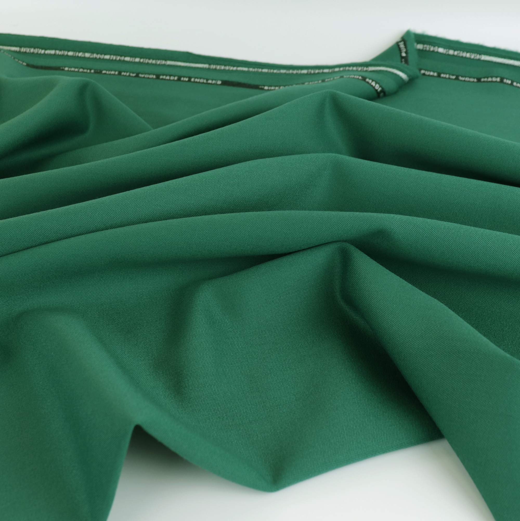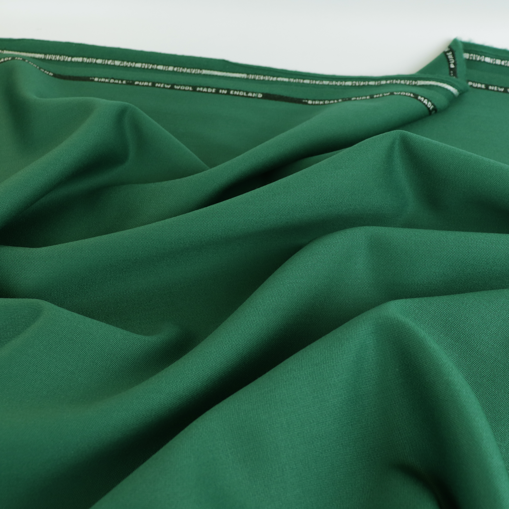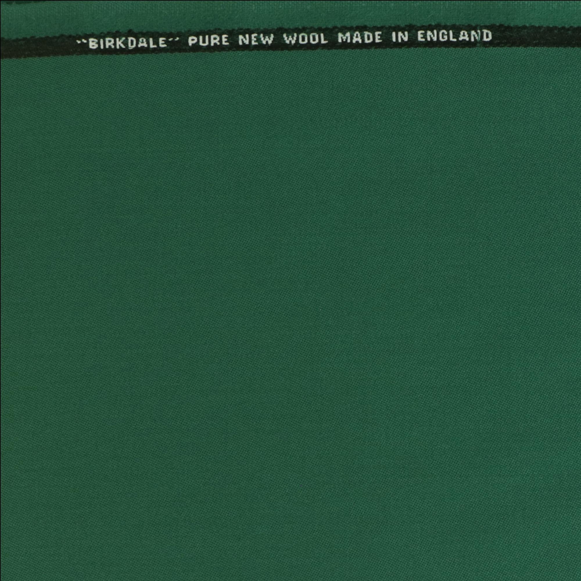 Deadstock worsted wool suiting was originally made in England. It has a moderate drape and is medium weight. It is a beautiful deep green colour. It would look fantastic made up into a pair of trousers.