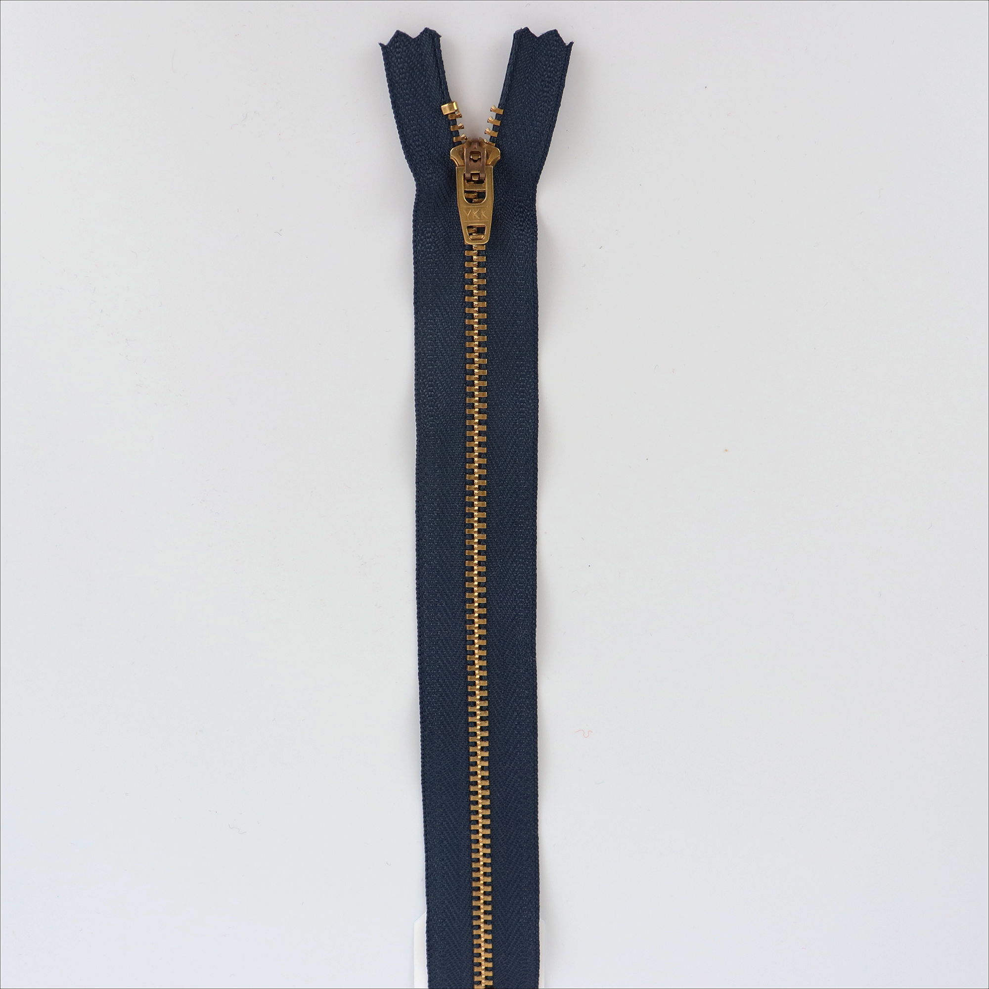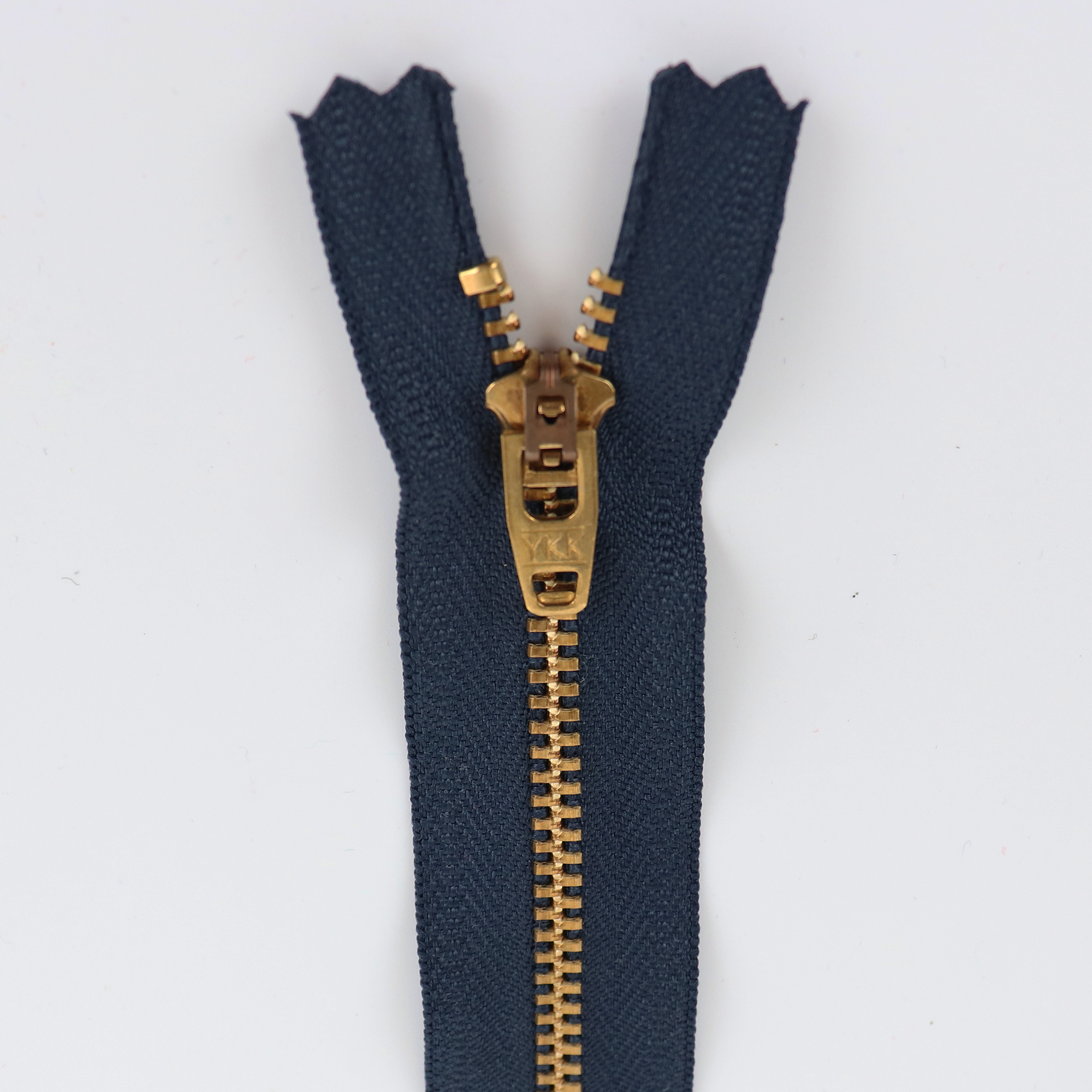 YKK zip with brass teeth and a navy tape, ideal for jeans.