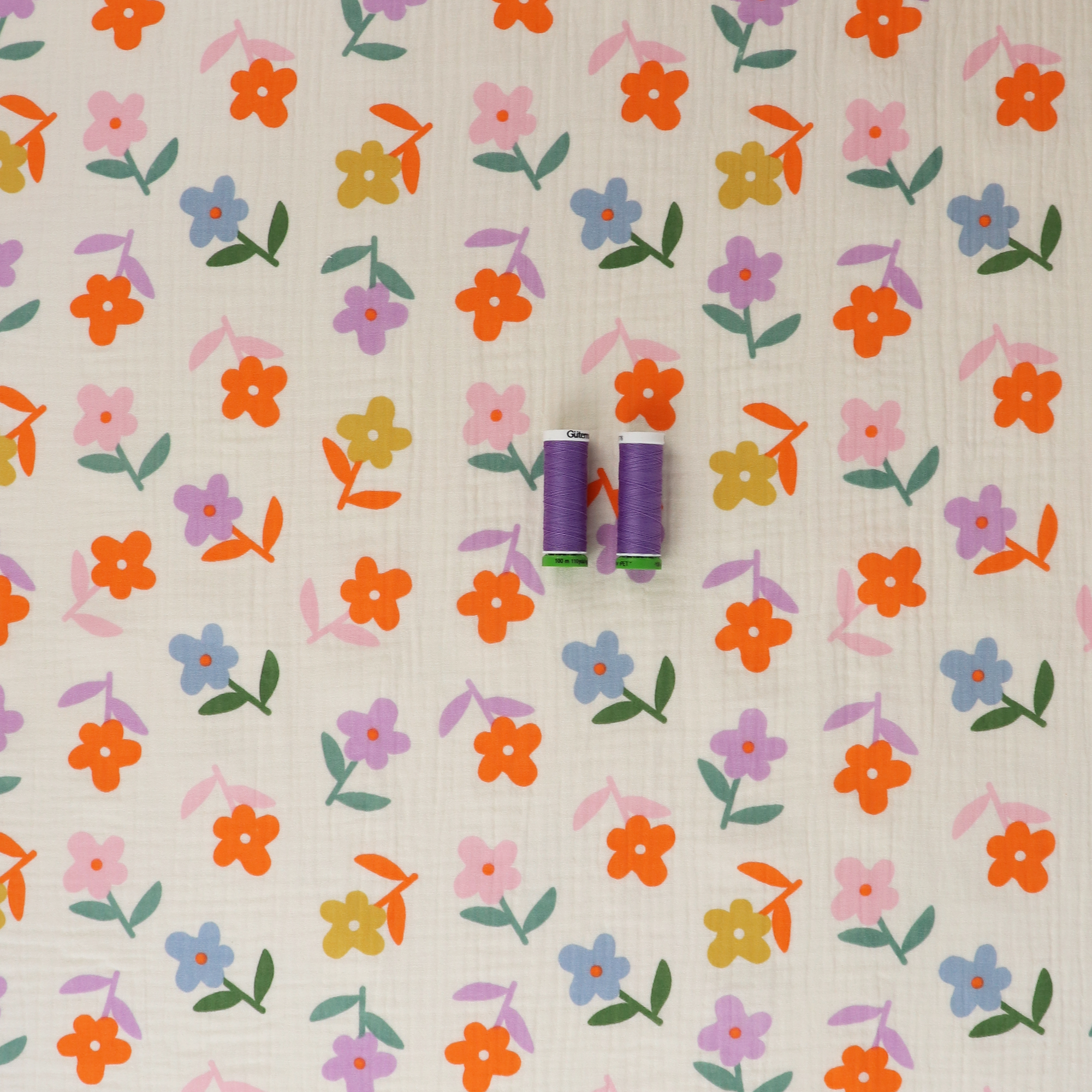 Double cotton gauze is lightweight, soft to touch and has a moderate drape. It has an off white coloured background and is covered in a fun brightly coloured floral design. It would be perfect for sewing a top such as the Tilly and the Buttons Stevie or The Sagebrush Top by Friday Pattern Company.