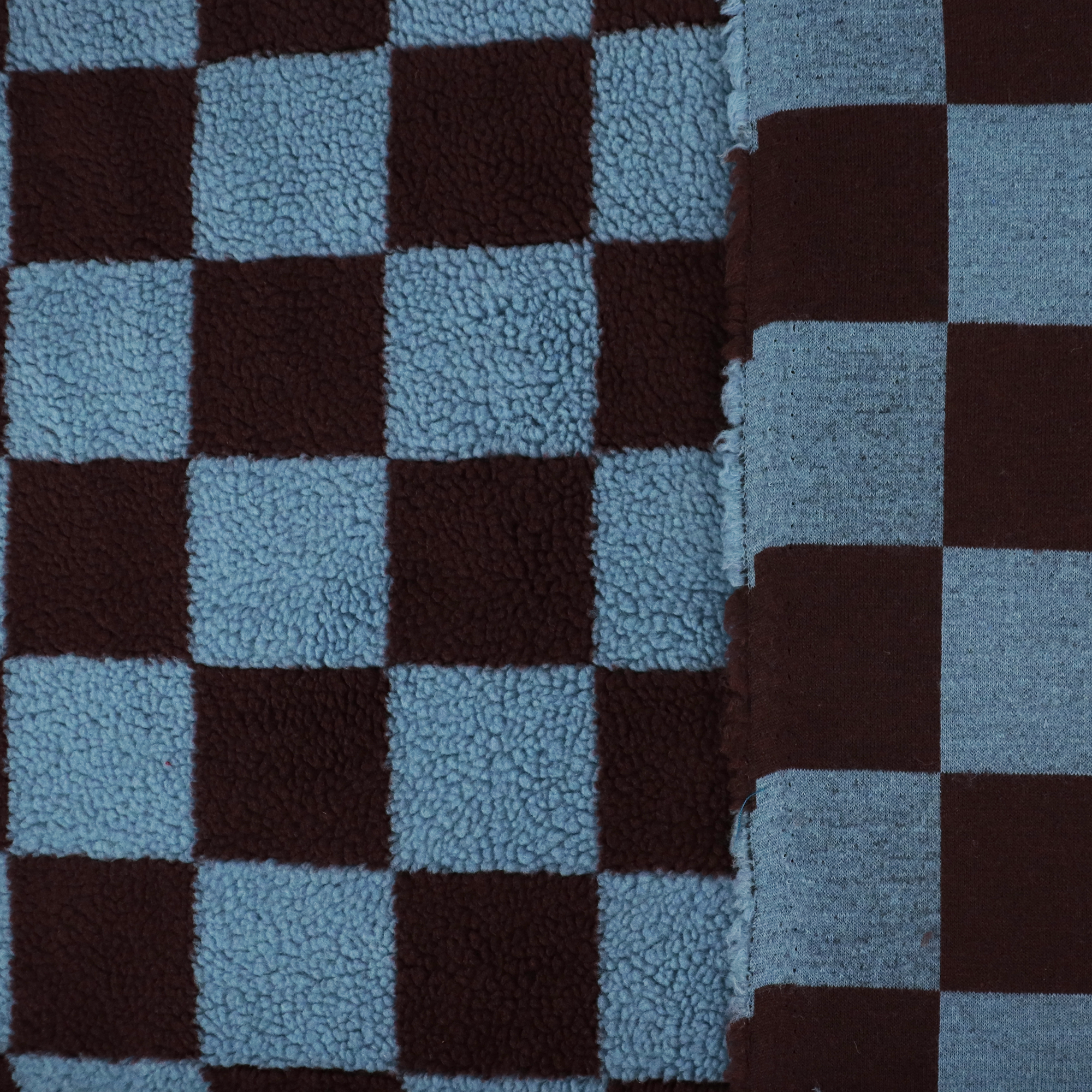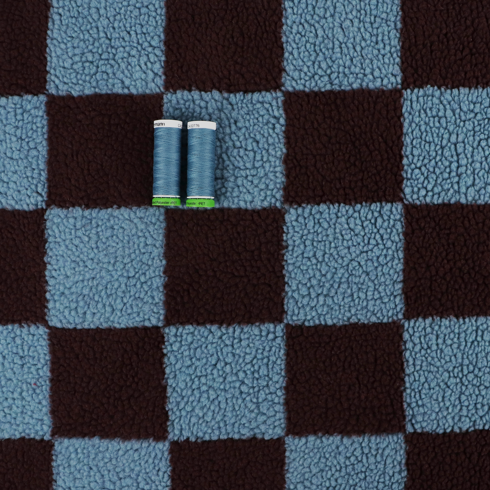 Teddy sherpa fleece coating has a wonderful plush texture on the right side making it perfect for coats such as the The Wimborne Coat by The Avid Seamstress or the Artemis by I AM Patterns. Or you could sew yourself a pullover or jacket, such as the Arlo Jacket by Friday Pattern Company. This teddy coating is covered in a large checkerboard design in a steel blue and maroon colour.